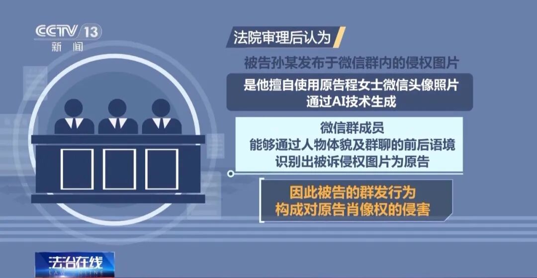 法院审理后认为,被告孙某发布于微信群内的侵权图片,是他擅自使用原告程女士微信头像照片通过AI技术生成,微信群成员能够通过人物体貌及群聊的前后语境,识别出被诉侵权图片为原告,因此被告的群发行为构成对原告肖像权的侵害。被告利用AI软件将原告穿着得体的微信头像照片生成为女性胸部暴露的图片,引发了微信群内针对原告的不当讨论,客观上导致了他人对原告的低俗化评价,构成对原告肖像权、名誉权的侵害。以私信形式发送给原告的衣着暴露、身体畸形的图片也侵害了原告的人格尊严,构成对原告一般人格权的侵害。