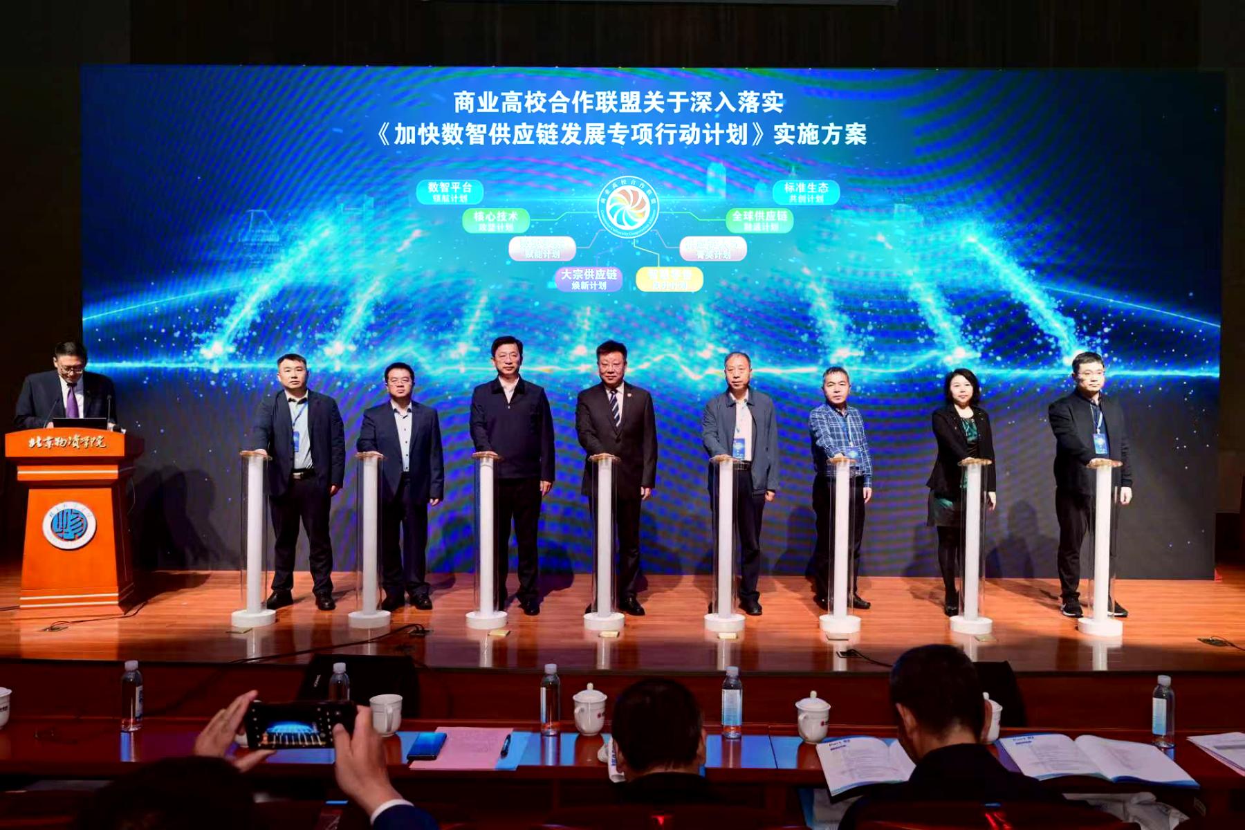 会上,来自北京物资学院、北京工商大学、天津商业大学、浙江工商大学、哈尔滨商业大学、安徽财经大学、兰州财经大学、重庆工商大学8所学校组成的商业高校合作联盟的领导代表,共同见证了《关于深入落实<加快数智供应链发展专项行动计划>实施方案》的发布。据悉,该方案由北京物资学院牵头,各联盟高校参与,形成了“数智平台领航计划、核心技术攻坚计划、数据要素赋能计划、大宗供应链焕新计划、智慧零售跃升计划、供应链人才菁英计划、全球供应链融通计划和标准生态共创计划”八大行动计划。