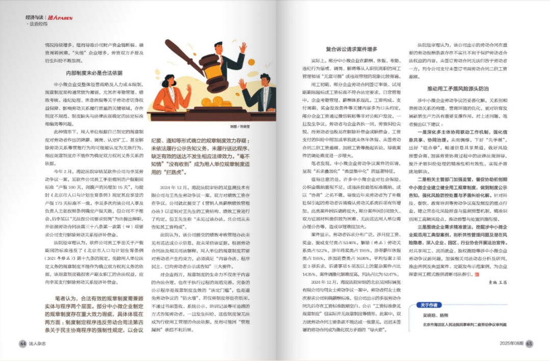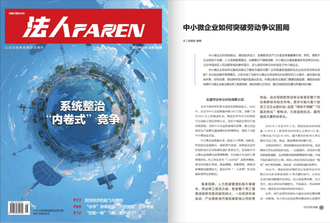 中小微企业在吸纳就业、增加经济活力、发展新质生产力方面发挥着重要作用。然而,受限于企业架构不完善、人力资源管理落后、法律意识不强等因素,中小微企业面临着诸多劳动争议纠纷。北京市海淀区人民法院审结的案件显示,近七成劳动争议纠纷发生于中小微企业。