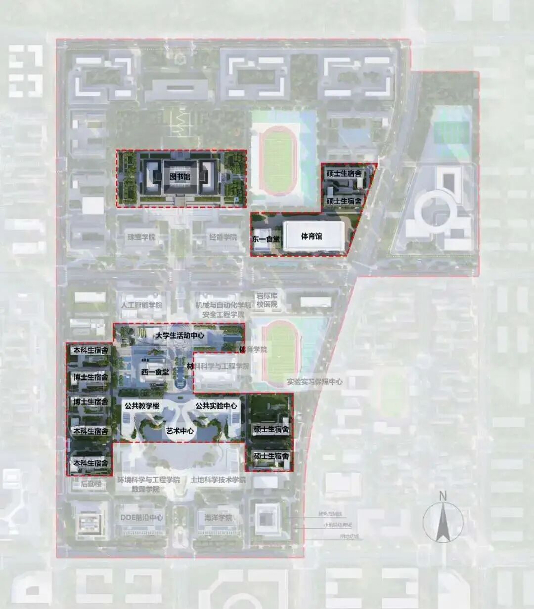 包含公共建筑(公共教学楼、公共实验中心、艺术中心、大学生活动中心、图书馆、体育馆),宿舍建筑(一期9栋),食堂建筑(东一食堂、西一食堂)