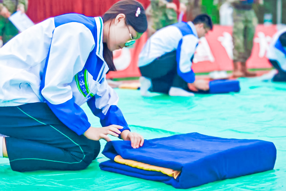 15日上午,军训总教官带队检查各参训班级寝室内务整理情况,现场评出了“文明寝室”。各参训班级还开展了“叠军被”比赛。田径运动场上,随着倒计时口令响起,叠被好手迅速到位,量尺寸、捏被角、塑边线……不多时,一床床平整美观、有棱有角的军被就完美呈现在大家眼前。这不仅是内务能力的比拼,更是传承抗战军民艰苦奋斗、精益求精精神的生动实践。