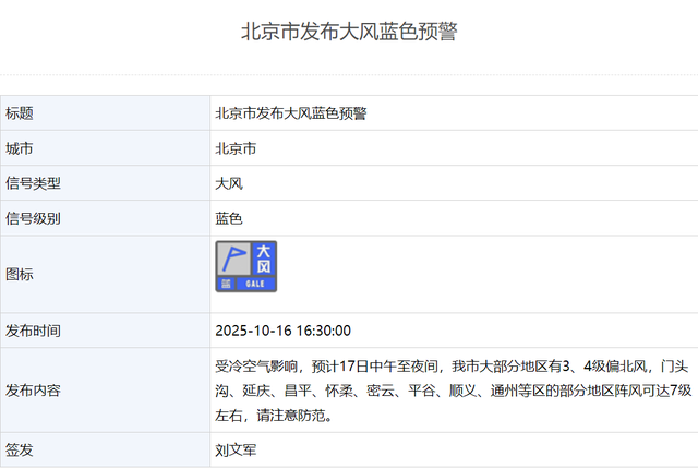 10月16日16时30分,北京市发布大风蓝色预警。受冷空气影响,预计17日中午至夜间,我市大部分地区有3、4级偏北风,门头沟、延庆、昌平、怀柔、密云、平谷、顺义、通州等区的部分地区阵风可达7级左右,请注意防范。