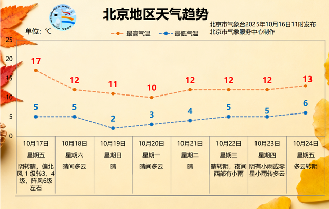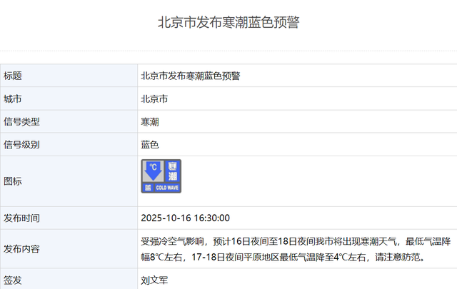 10月16日16时30分,北京市发布寒潮蓝色预警。受强冷空气影响,预计16日夜间至18日夜间我市将出现寒潮天气,最低气温降幅8℃左右,17-18日夜间平原地区最低气温降至4℃左右,请注意防范。