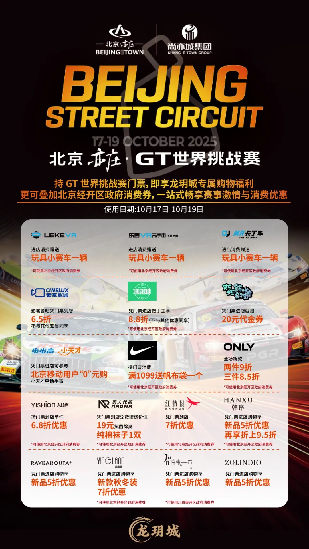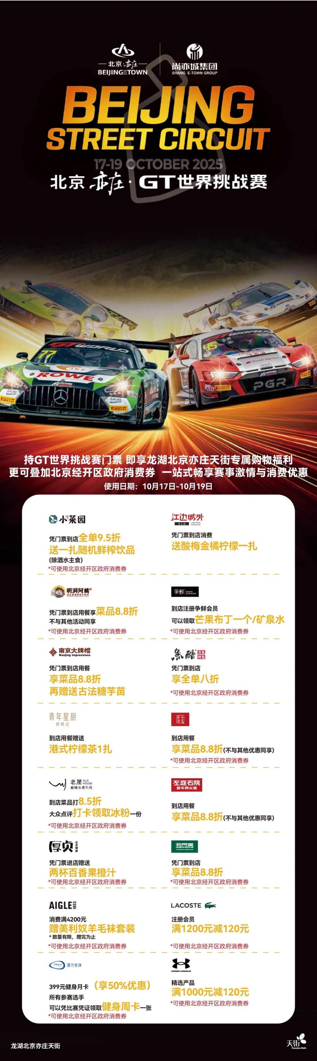 持GT赛有效票根,即可直达以下商圈兑换惊喜福利——餐饮、零售、体验多场景优惠全涵盖,让赛事热度落地成看得见的消费快感!其中龙玥城、龙湖北京亦庄天街的多家店铺,还支持使用北京经开区政府消费券,福利再加码!