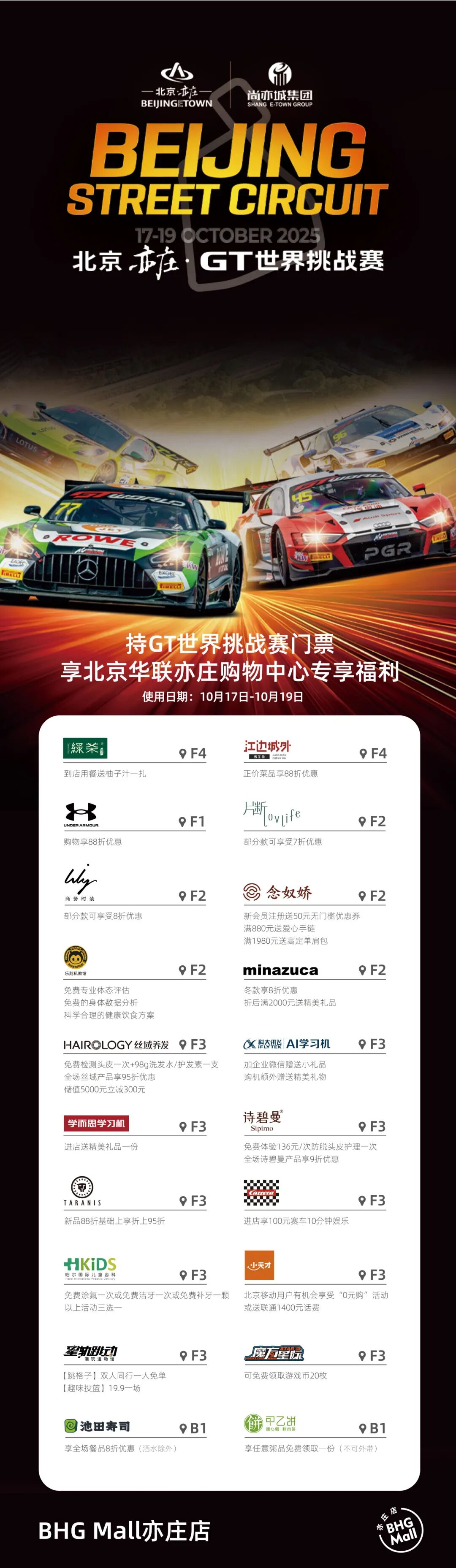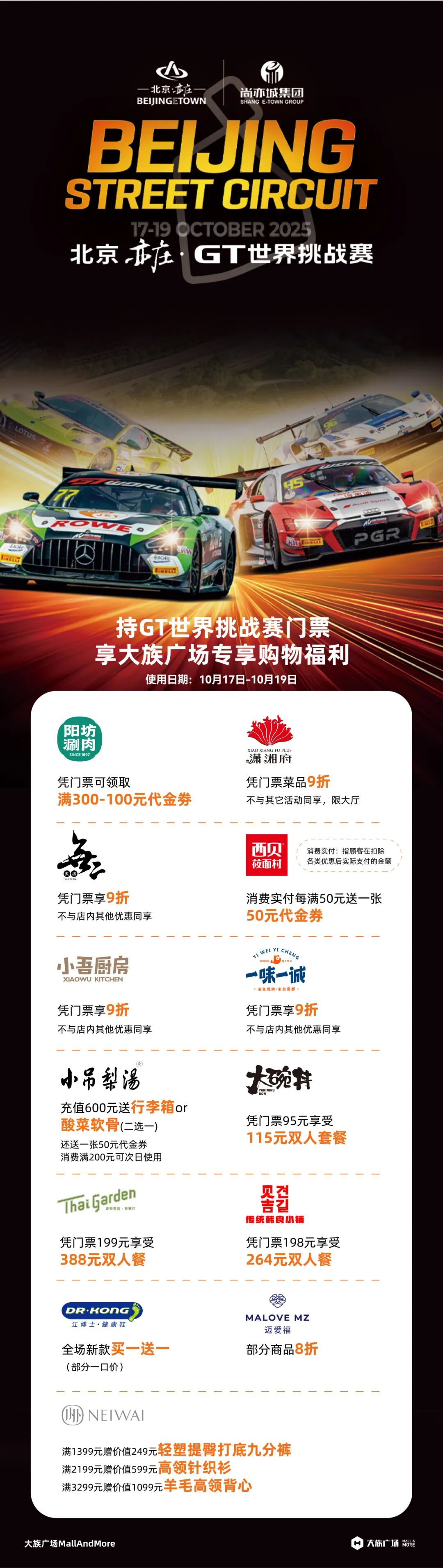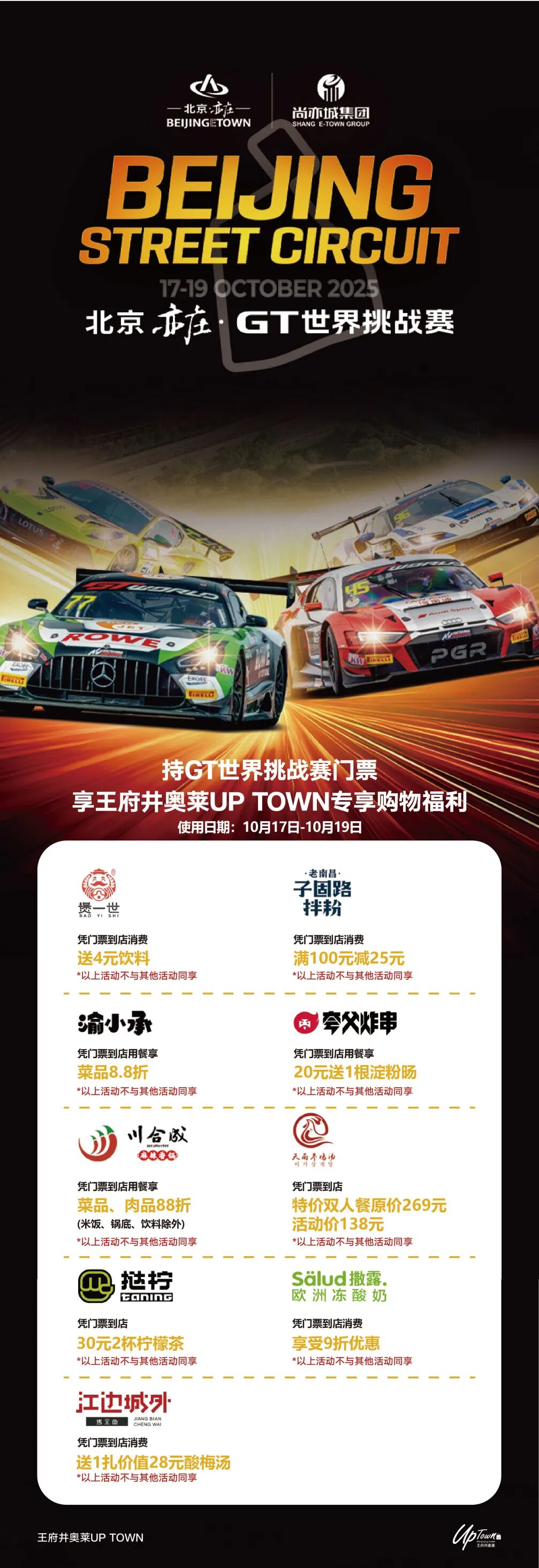 优惠需凭GT赛完整实体票根/电子票根核销,复印件无效;每个商圈优惠可单独参与,具体细则以商户现场说明为准;福利有效期与赛事周期联动,错过再等一年,记得及时使用!