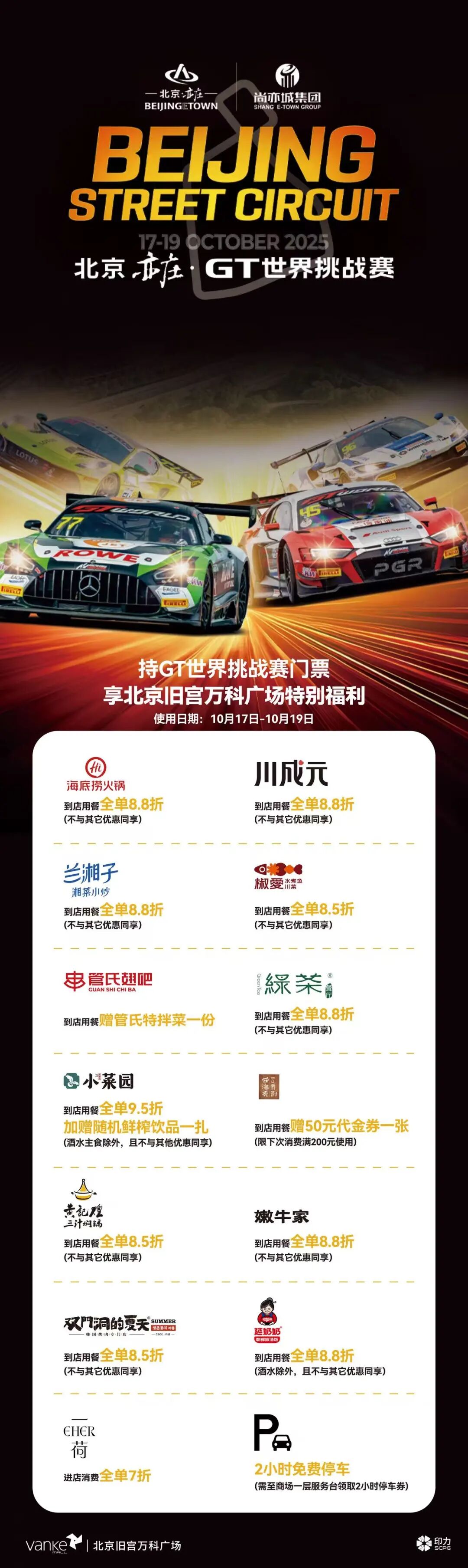 10月17日-10月19日,持GT赛票根进店用餐,享受全单85折优惠(不与门店其它活动同享)。