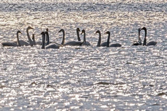 今天上午,天气晴好。天鹅湖里,首批抵达的19只大天鹅悠闲地戏水觅食,它们时而梳理羽毛,时而扇动翅膀,身姿舒展十分美丽。