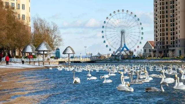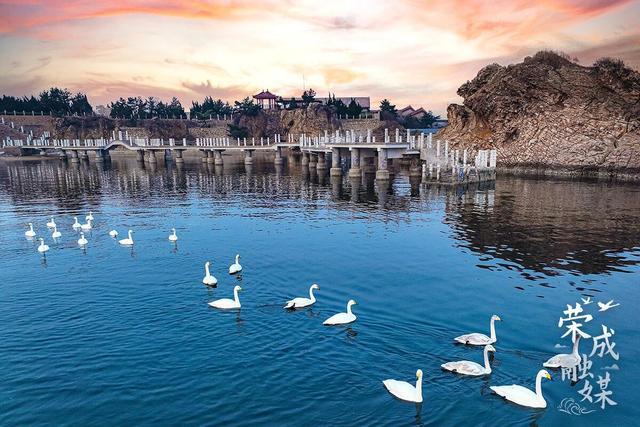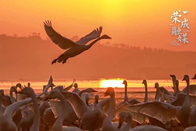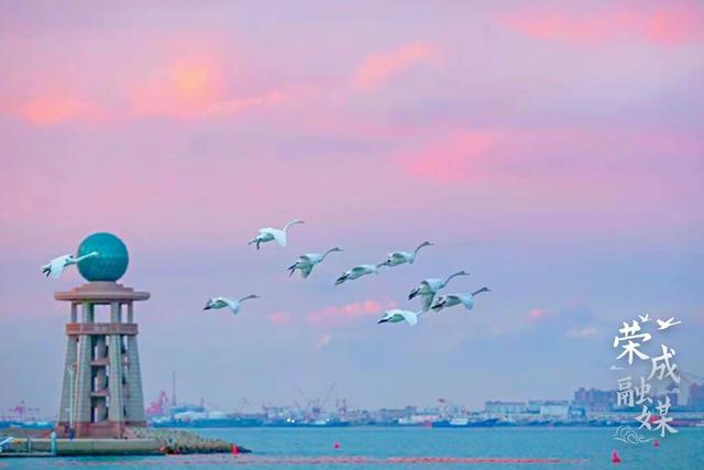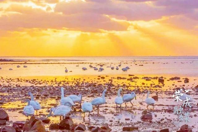 荣成作为大天鹅的最佳越冬栖息地之一,每年自10月中旬开始,上万只大天鹅从西伯利亚、蒙古来到荣成,主要栖息在烟墩角海湾、天鹅湖海面以及荣成沿海、湿地、河道等地,觅食、游玩、嬉戏、飞翔。