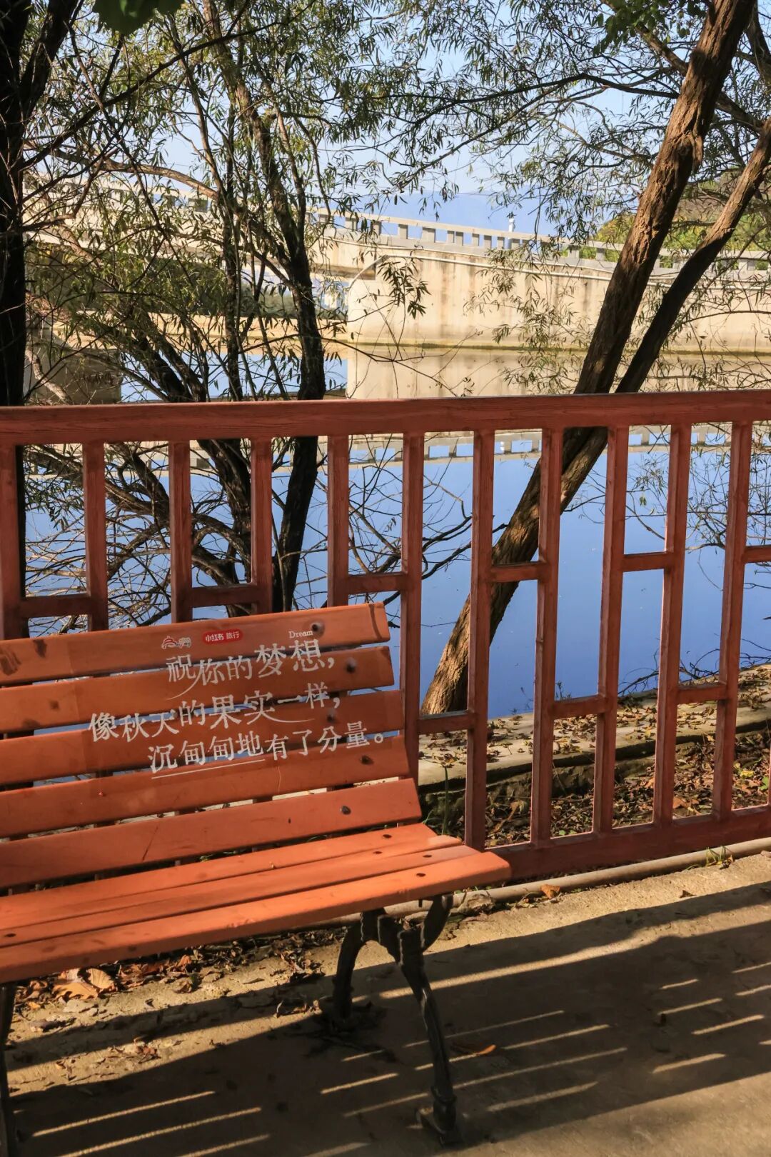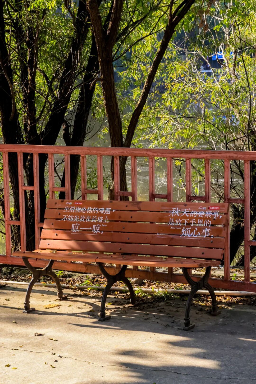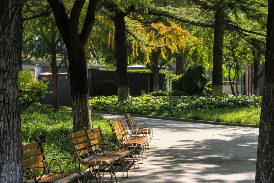 午后的阳光变得斜长而金黄,透过枝叶,在地面与长椅上投下斑驳的光影。