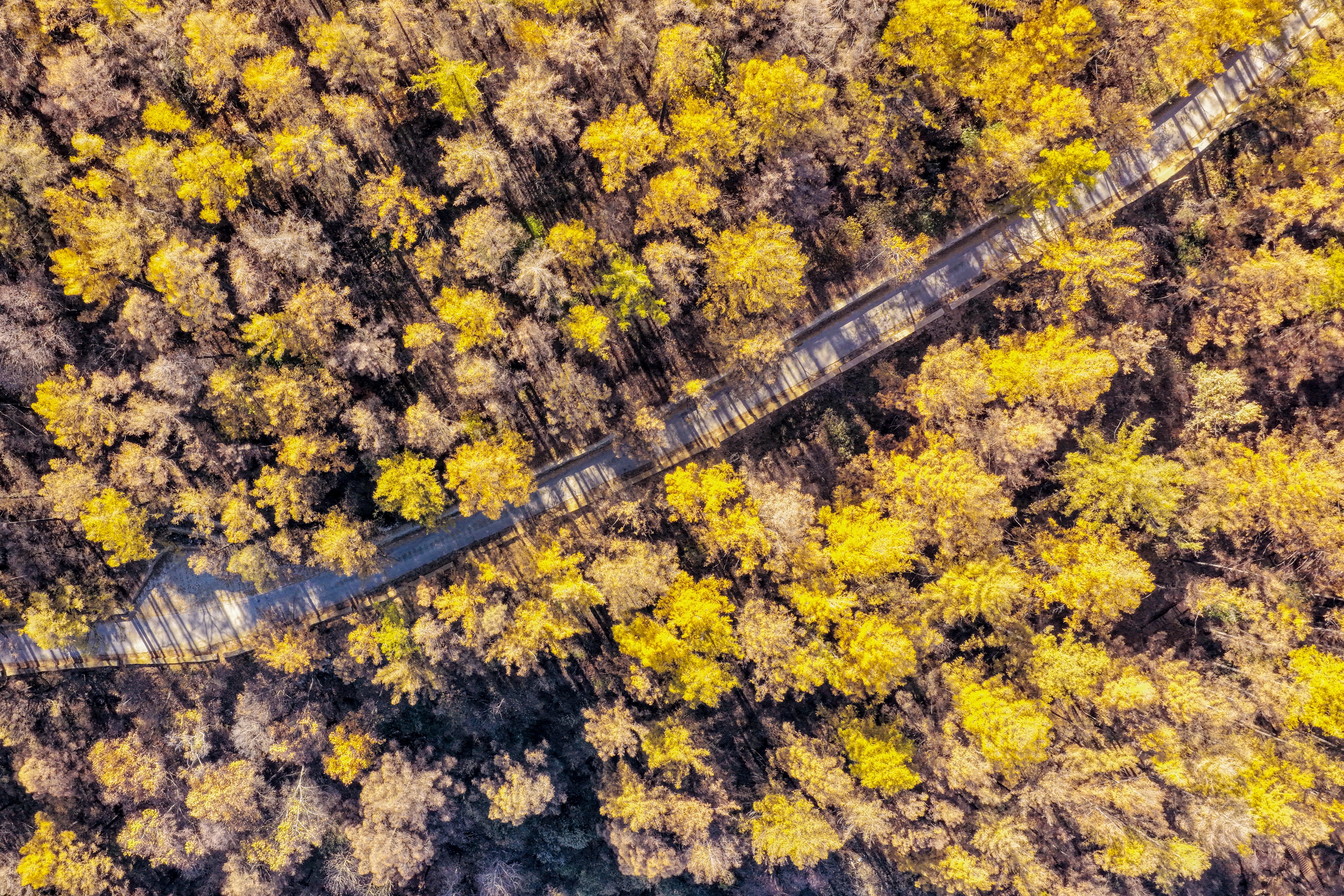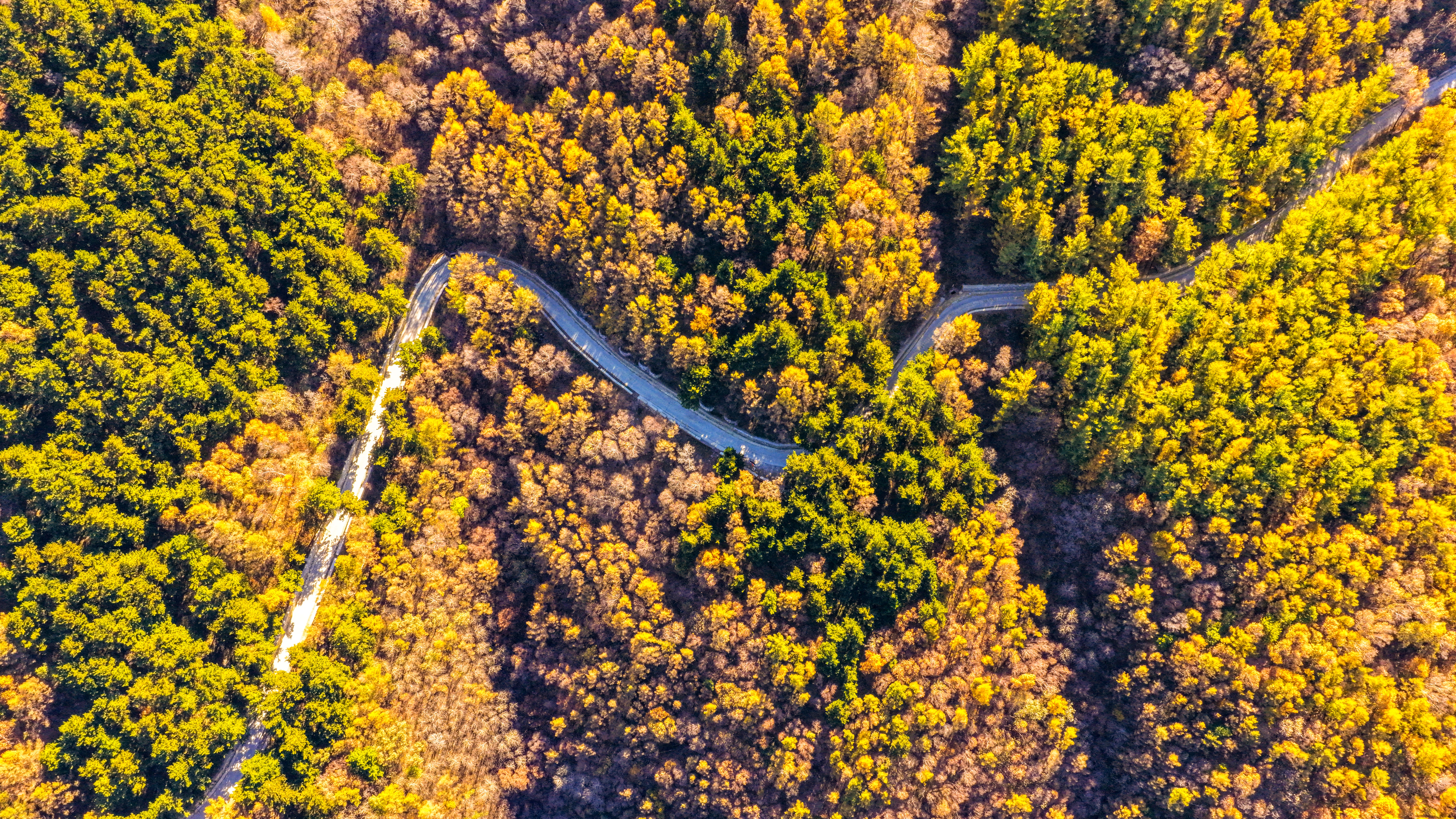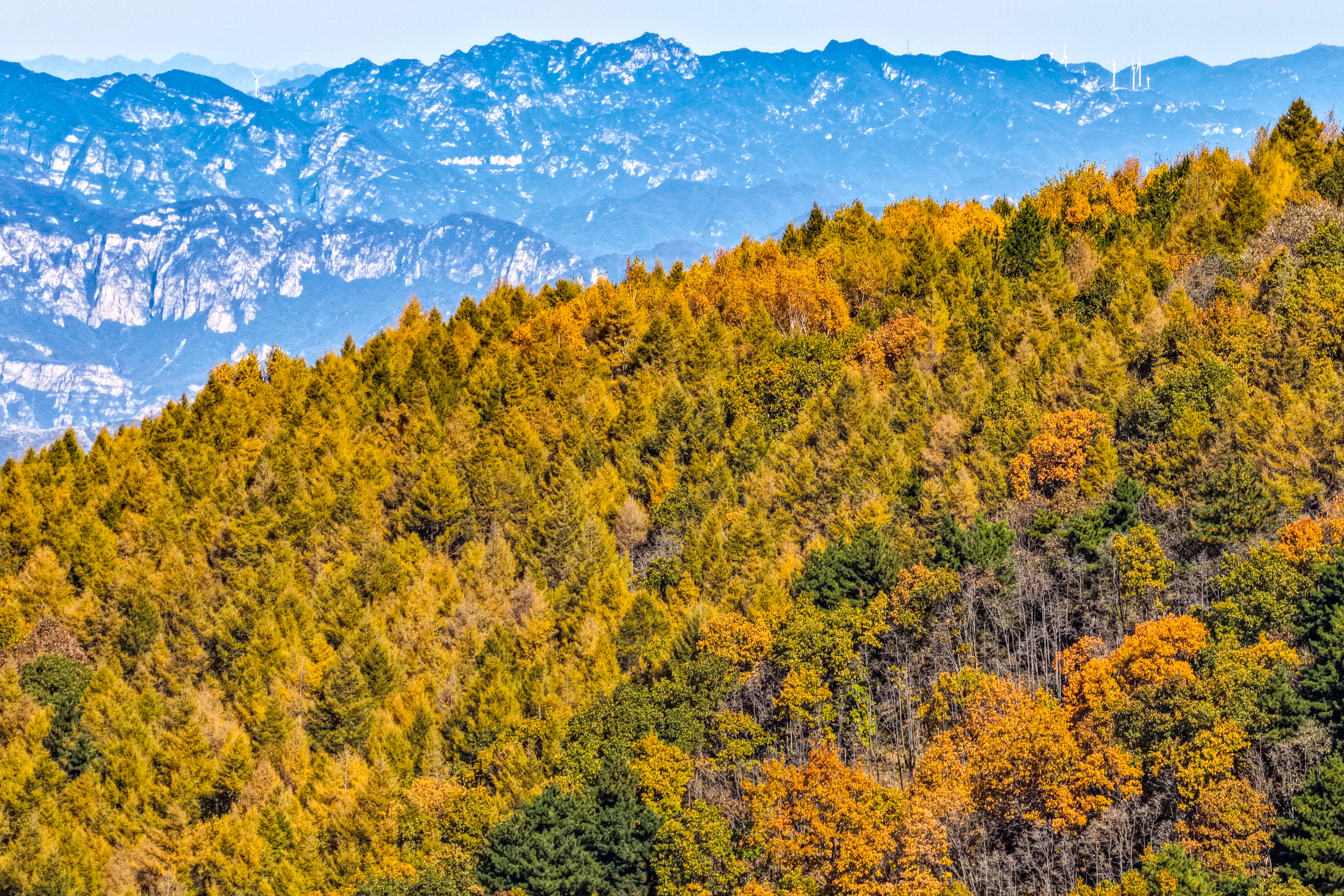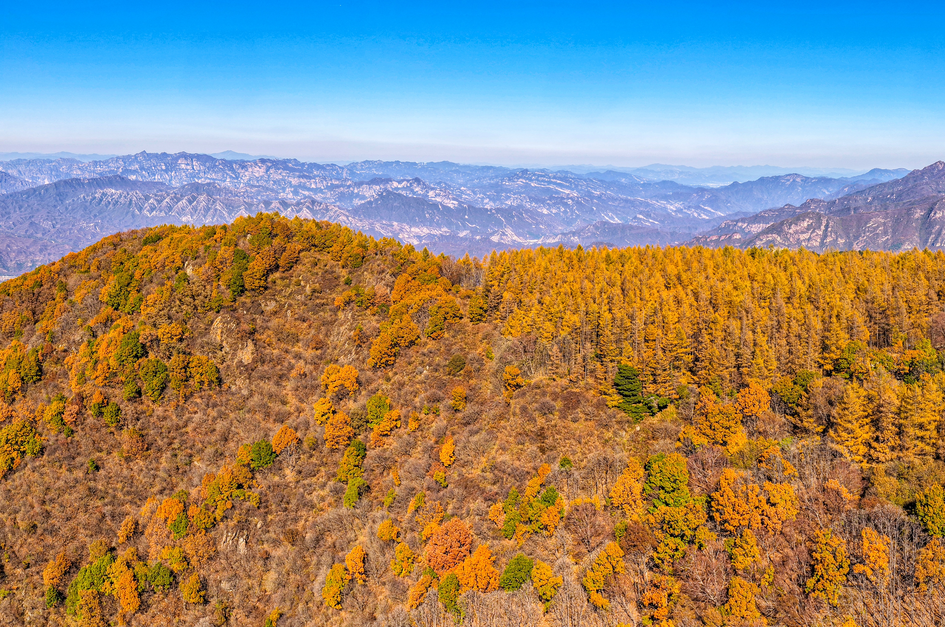 十月中旬,秋意渐浓。门头沟山区的京西林场悄悄换上了五彩盛装。红叶似火,黄叶如金,绿叶依旧苍翠。大自然像打翻了调色盘,把群山染成一幅流动的油画。
