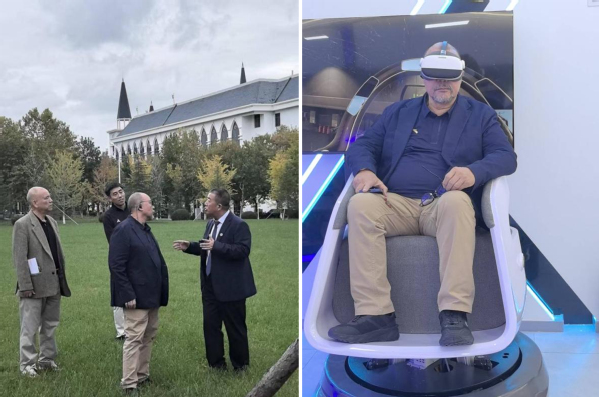 座谈会后,在孙承武的陪同下,谢广汉一行实地考察了学校教学场所与校园环境,并走进元宇宙创新实验室,亲身体验了虚拟仿真等教育教学设备,深入了解学校在智慧体育教育领域的探索成果。