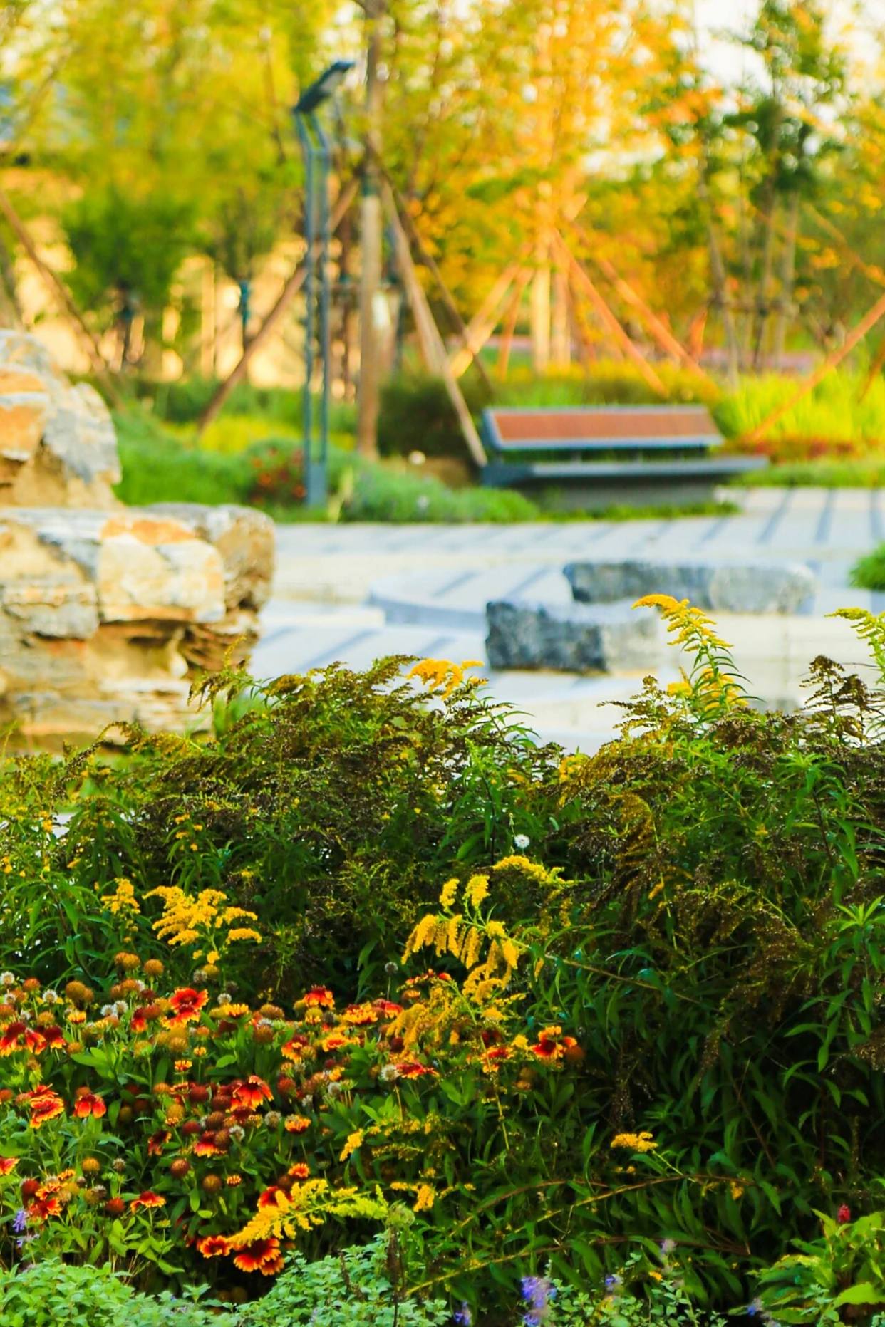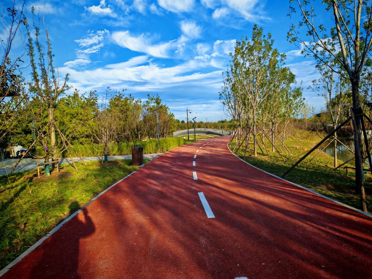 沿玉河南路自西向东漫步,左侧“玉湖人文区”碧波轻荡,秋风拂过水面,惊起白鹭翩飞;右侧“邻里休闲区”传来孩童嬉笑。