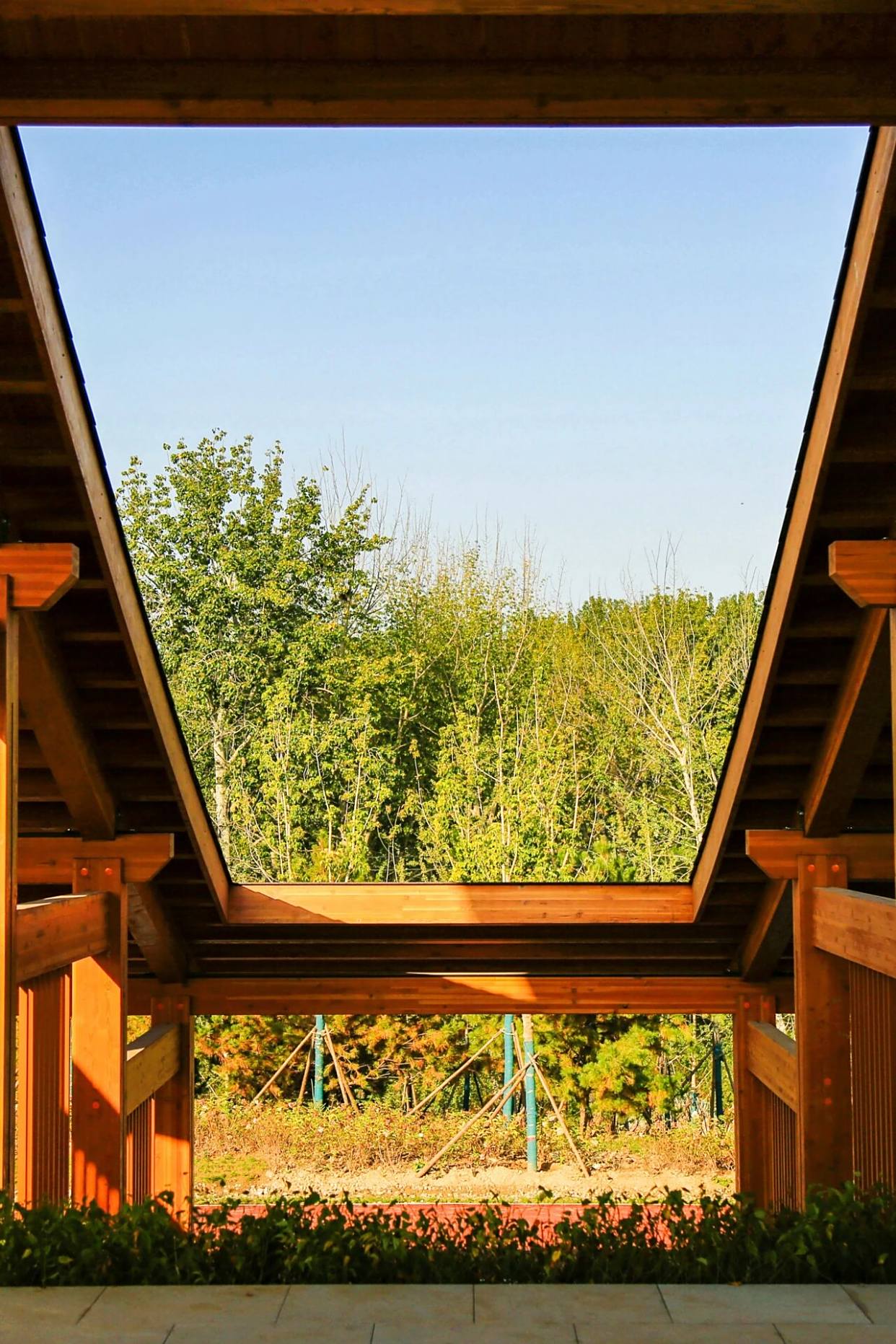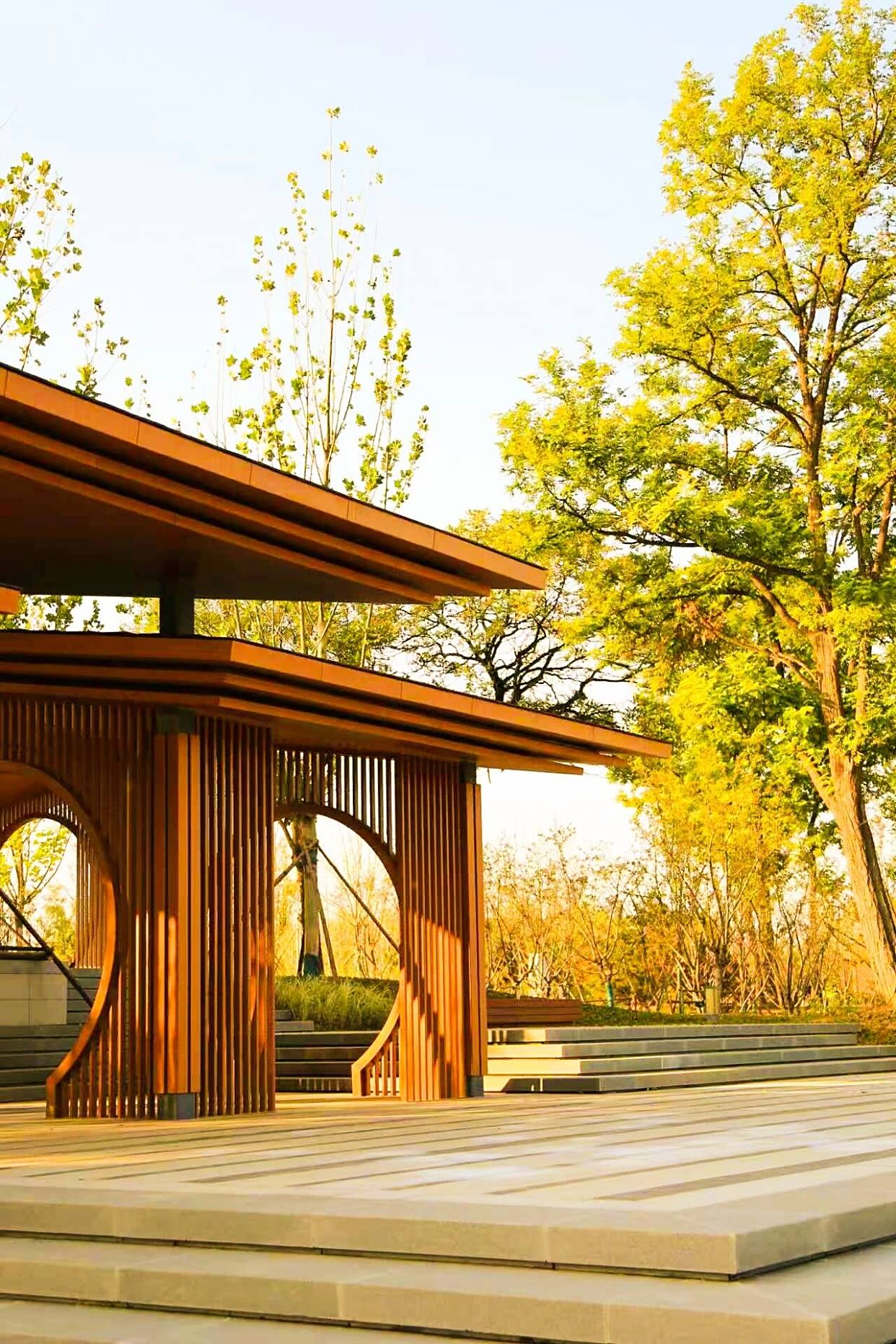 最引人驻足的是那座起伏流畅的湖心廊桥,靓丽倩影倒映水中,与远处“一片青瓦”般架于山间的观景台遥相呼应,传统建筑美学在现代园林中焕发新生。