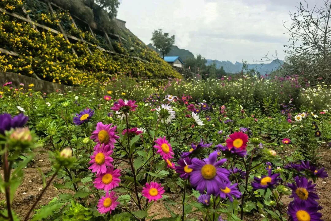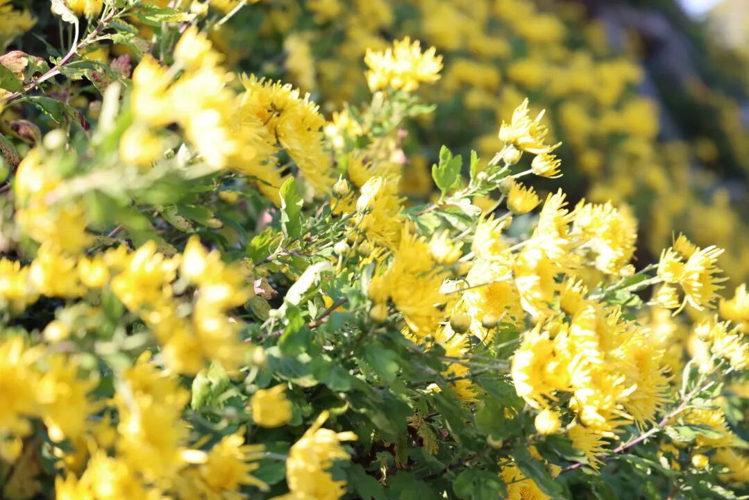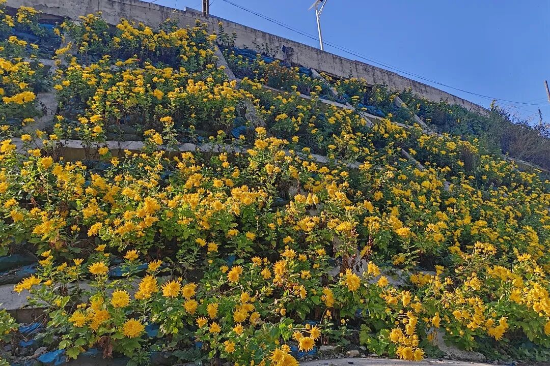 通过村企合作,南山云居和口儿村村集体先后购置17万株菊花种苗,由村委会统筹组织人力进行种植、养护,其中七万株菊花被科学地种植在村内2处已经完成修复的地质灾害点位防护坡上。经过半年的精心养护,菊花根系深深扎根护坡,实现了固土防流失,有效增强了地质灾害隐患点的防护能力。口儿村更以菊文化场景培育为核心,全面推进了区域环境综合治理,更新了村内道路设施、增设了停车区域,新建了拍照打卡点位。如今,万株菊花陆续绽放,更将原本的“隐患点”变成了如今的“风景点”和“增收点”,实现了生态效益与经济效益的双赢。