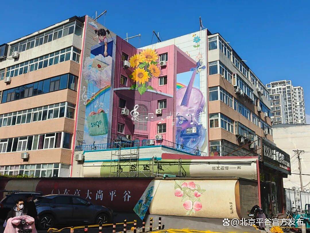 宜心社区的楼角立体画,把“文化+商业+社区生活” 的巧思藏进了画面里。下方巨大的“书籍地景”像是建筑变成一座打开的城市书房,大桃指向“平谷桃乡”的在地IP,小提琴与跃动的五线谱由建筑转角“穿墙而出”,购物袋、“SHOP”等元素把文旅、商业与日常消费嵌入画面,云端女孩与信封、彩虹等梦幻元素,传达对美好生活的向往。