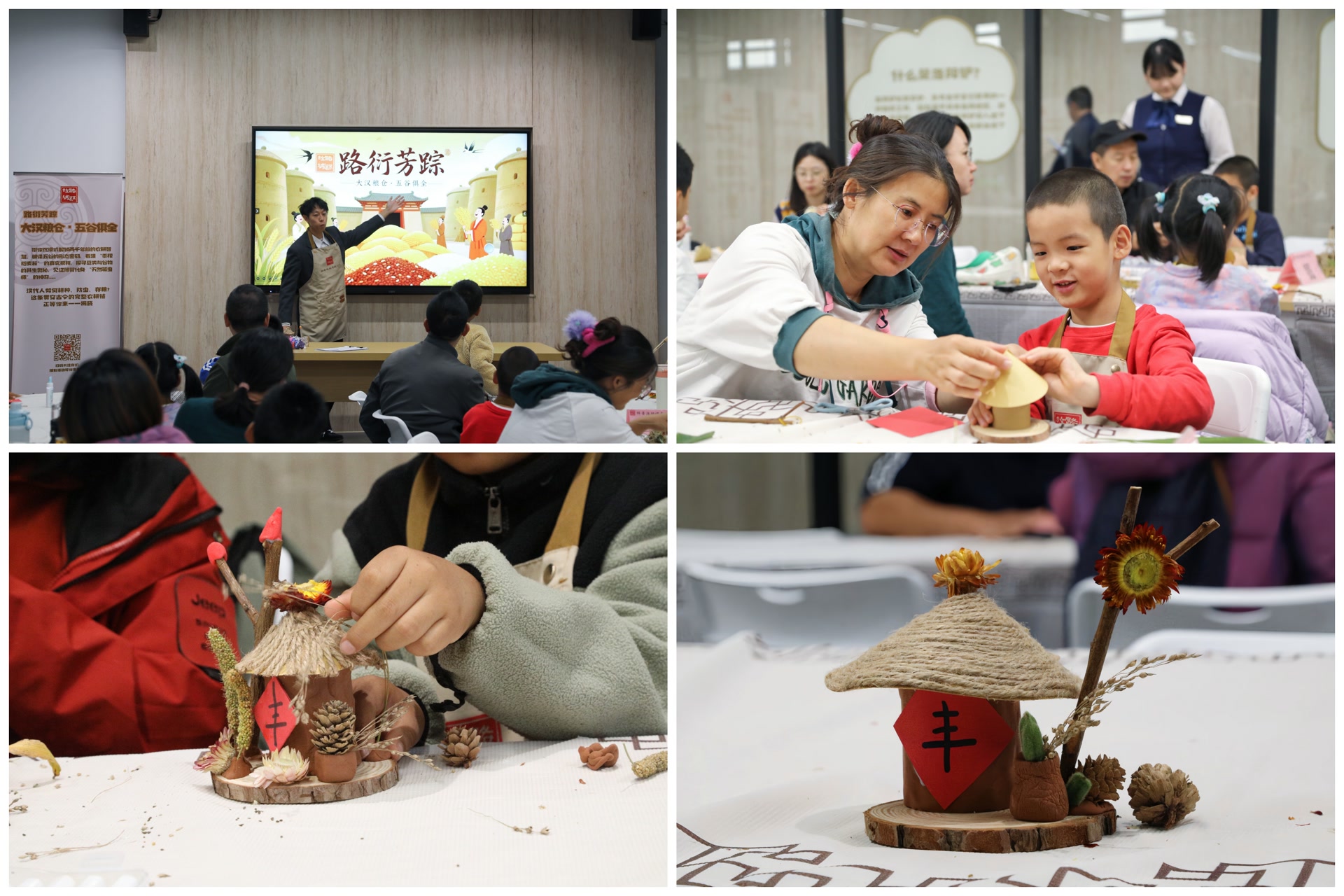 互动环节中,亲子家庭围坐在一起,用提前准备好的材料共同动手制作“粮仓”,再将收割的作物小心装入其中。看着自己的“劳动成果”被妥善收纳,同学们深切理解了“储粮护粮”的意义。