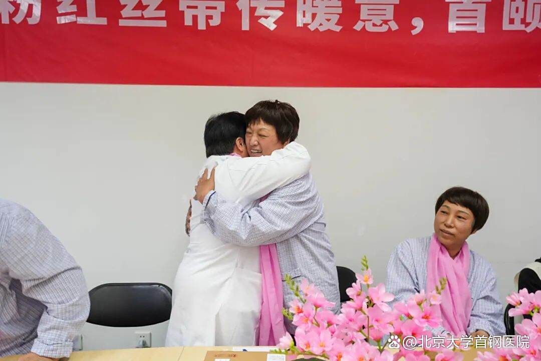 随后她分享泰戈尔的诗句,声音坚定有力:“愿每一位乳癌姐妹都能变成一束光,照亮自己,也温暖同行的人”,真挚话语如暖流淌过人心。王丕琳教授与李女士紧紧拥抱,掌心的温度、眼中的暖意,让在场众人倍感温暖。