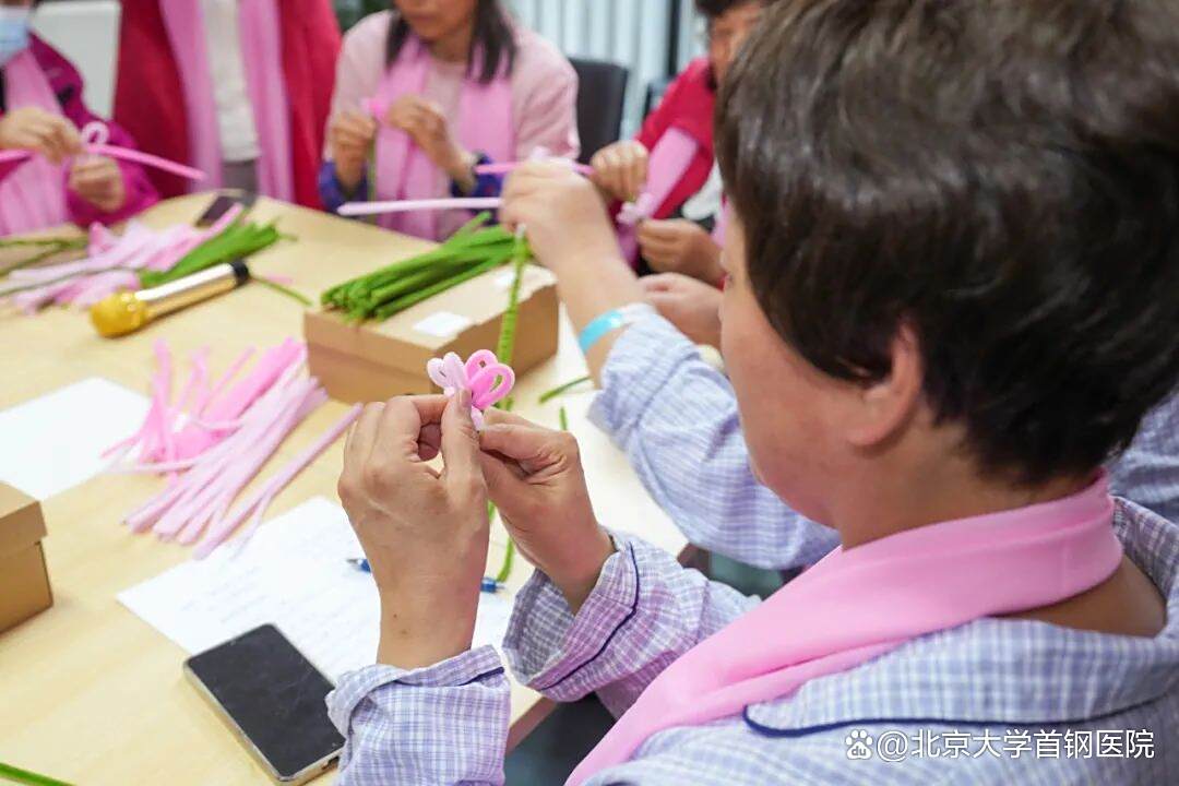 手工制作环节中,病友与北京粉红丝带志愿者围坐在一起,共同用彩色扭扭棒制作花朵。志愿者们手把手教病友塑形技巧,病友们分享康复心得,现场笑声不断,每片“花瓣”都凝结着对生活的热爱与对未来的期许。活动尾声,全体参与者手持扭扭棒花束集体合影,医护、病友、家属与北京粉红丝带志愿者的笑容定格在一起,满含爱与希望。活动结束后,许多病友仍久久不愿离去,或与医护人员轻声交流,或与其他病友分享感受,空气中的温暖与感动久久未散。