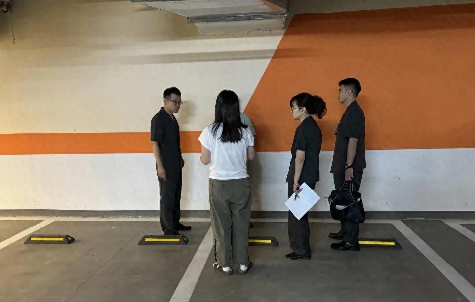 “公平起见,咱们每人一把尺子,都量一量。”梁栋指挥双方拿出自己的工具。经过三方测量,案涉车位地面划线长5.3米,宽2.4米,符合车位最小尺寸。但根据规定,还应去除背景墙字体厚度及管道高度,车位实际尺寸为长5.26米,高2.18米,均低于行业标准。“只差几厘米,影响不大。”开发商代表说道。