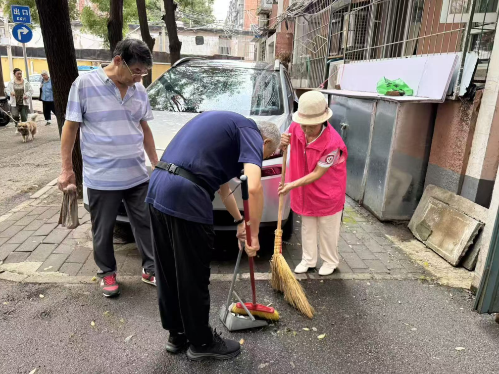 左北里志愿者自发组织为社区小花园清理卫生,为居民量血压、测血糖,为居民排忧解难,共筑温馨家园。