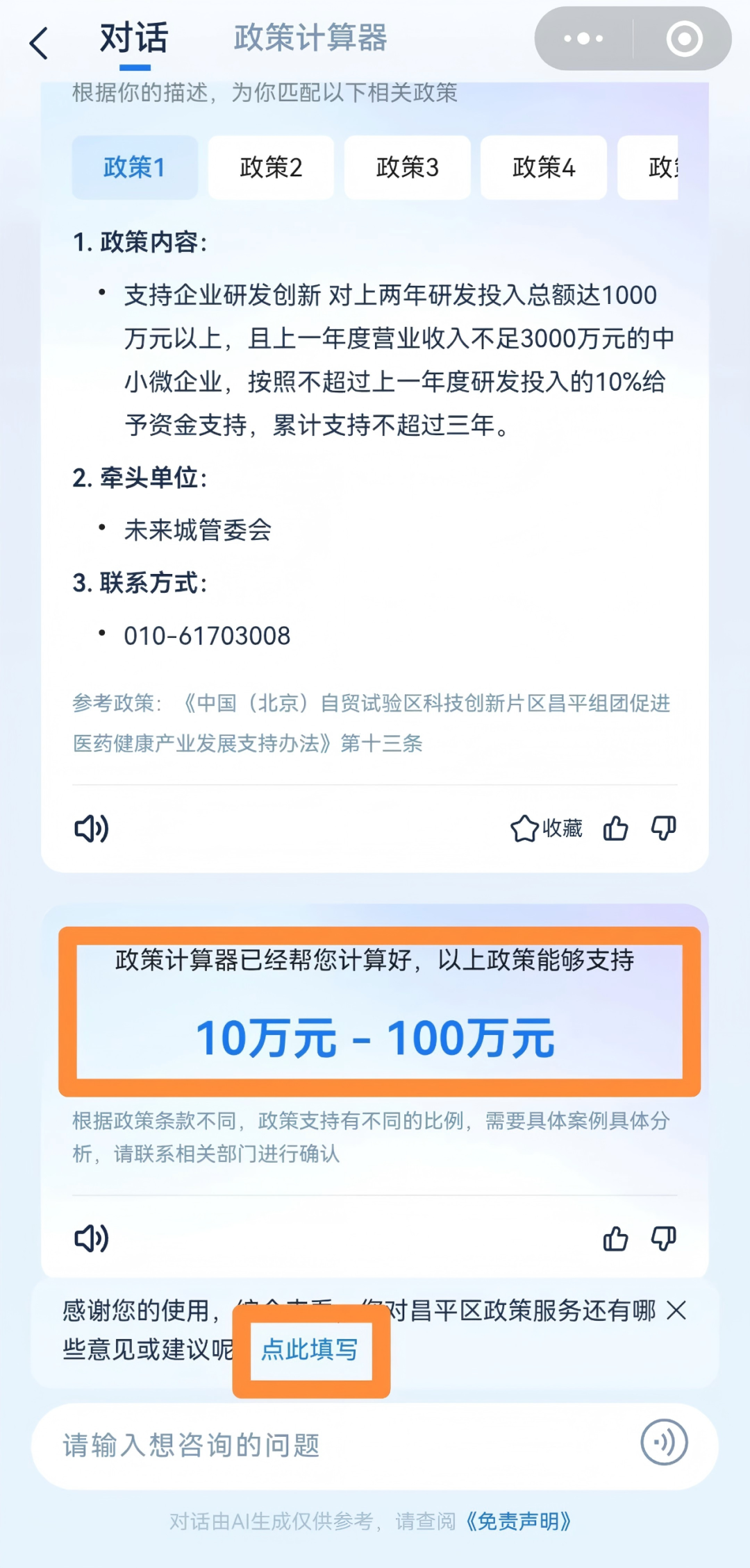 为将政策服务“最后一公里”缩短至企业手边“最后一厘米”,切实解决企业在获取政策服务中遇到的各类问题,“昌慧达”人工智能“政策计算器”创新设计企业诉求采集功能,企业可在“昌慧达”人工智能“政策计算器”内反馈昌平区优化营商环境工作中的不足和建议,确保获悉企业每一个需求、回应企业每一项诉求,努力营造亲商、近商、重商、宜商的良好环境。