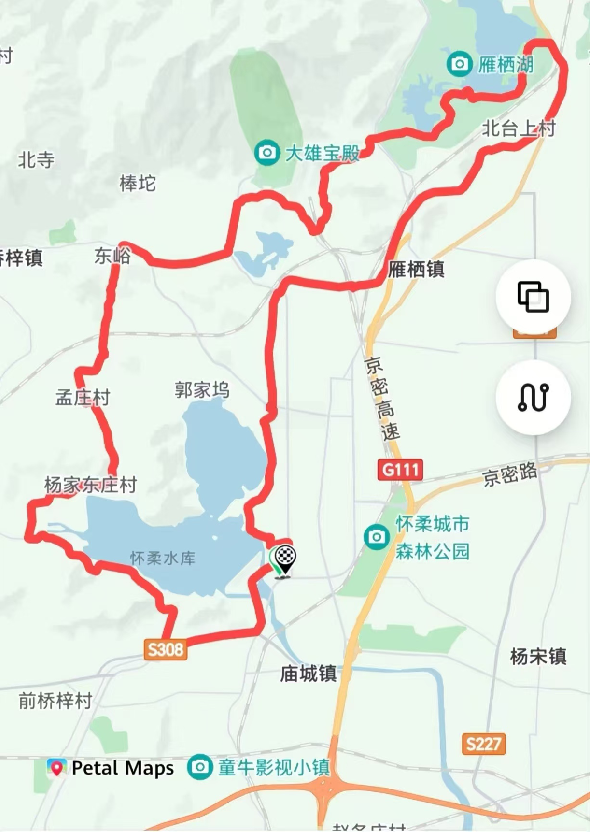 怀柔水库(龙山起点)→京密引水渠→雁栖湖路→日出东方凯宾斯基酒店→红螺寺→靶场路→红军庄村→孟庄村→杨家东庄村→怀柔水库(龙山终点)