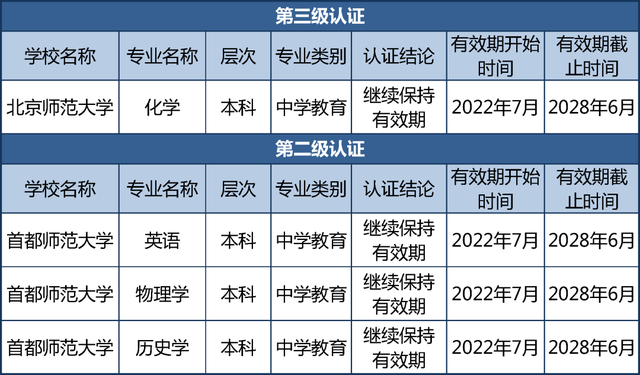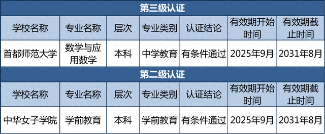 经高校申请、教育评估机构组织专家考查、普通高等学校师范类专业认证专家委员会审定,17个专业通过第三级专业认证,576个专业通过第二级专业认证,认证结论有效期六年,自2025年9月起至2031年8月止。