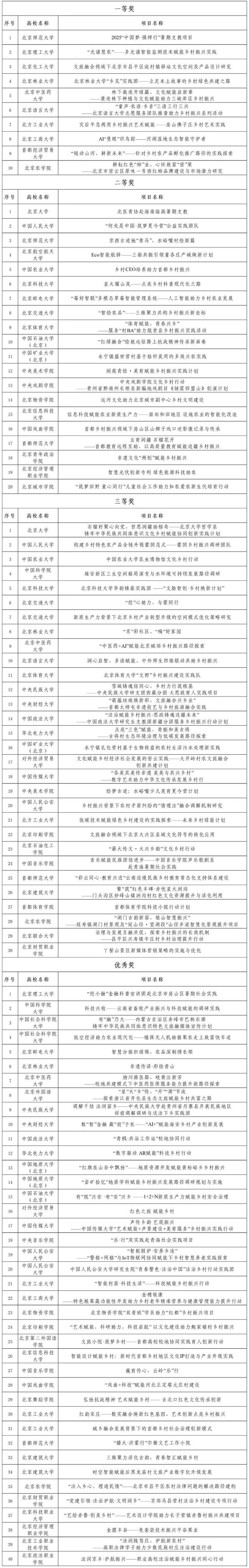 今年6月,北京市委教育工委、市教委启动2025年首都高校师生服务乡村振兴行动计划,遴选优秀团队深入乡村开展实践活动、科学调研、志愿服务等,发挥专业优势,助力乡村振兴。近期,专家对100支立项团队进行成果评审,共评选出一等奖10项、二等奖20项、三等奖30项、优秀奖40项。