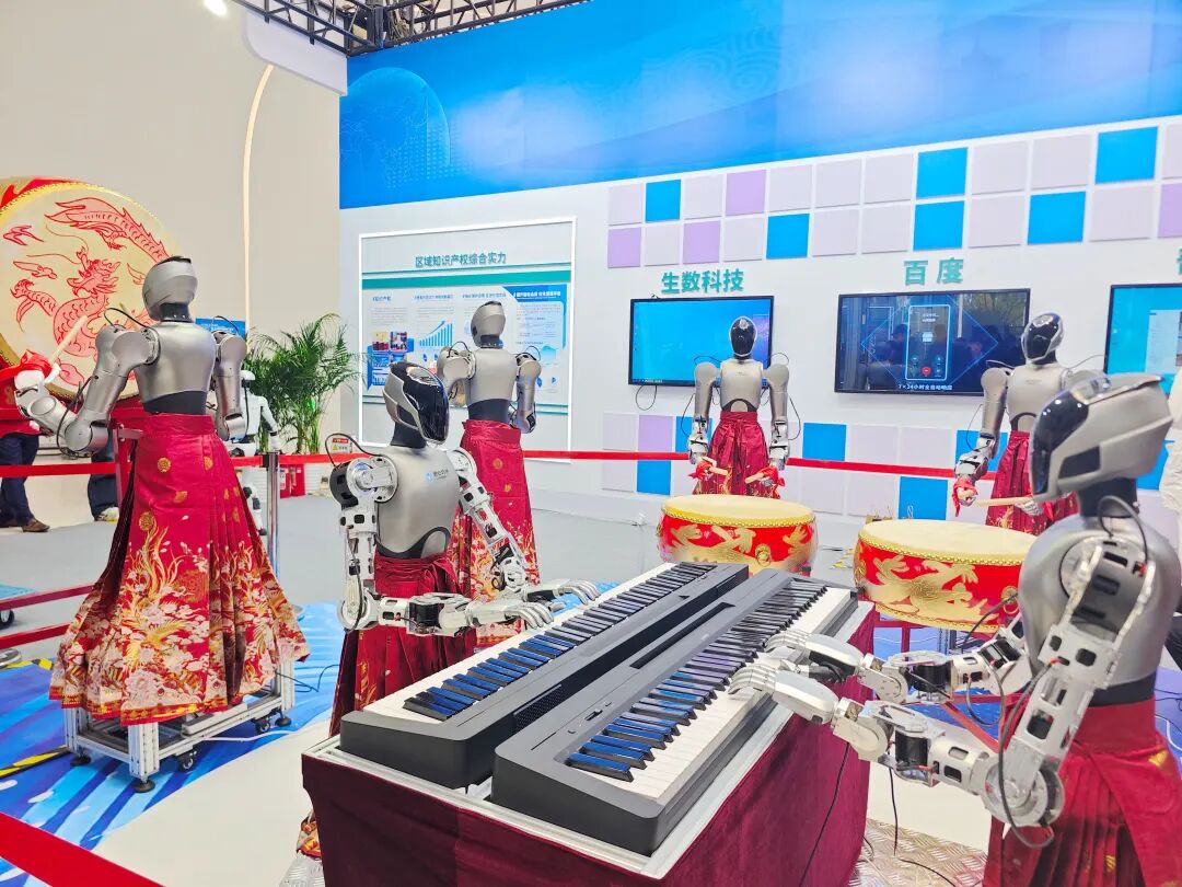 海淀科技展有人工智能区域、交互投影互动体验区、AI打卡点。机器人乐队的钢琴机器人、鼓乐机器人上演合奏,百度、生数科技等科技企业展示人工智能大模型,国术科技展示全息投影体验舱,等等。