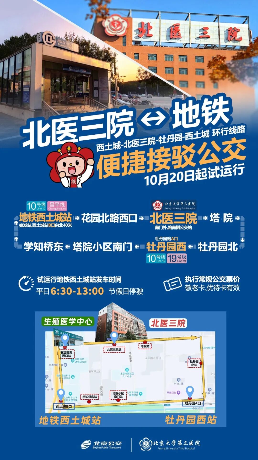 为方便患者、周边居民就医出行,解决地铁口至医院的“最后一公里”交通难题,花园路街道与多部门沟通协调,在各级交通委、交管部门的大力支持下,北京市公交集团于2025年10月20日起,开通北医三院本部通医公交接驳专线(试运行)。