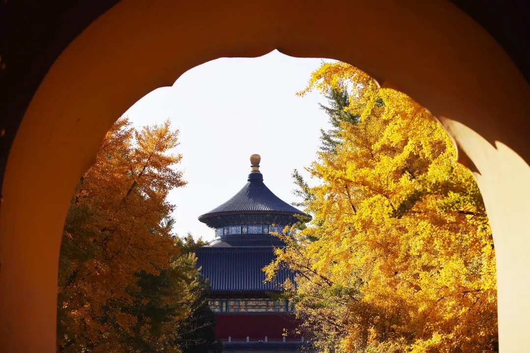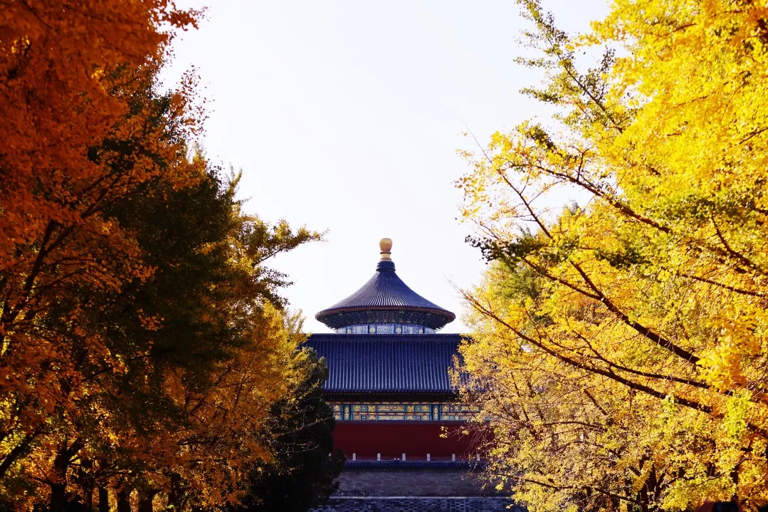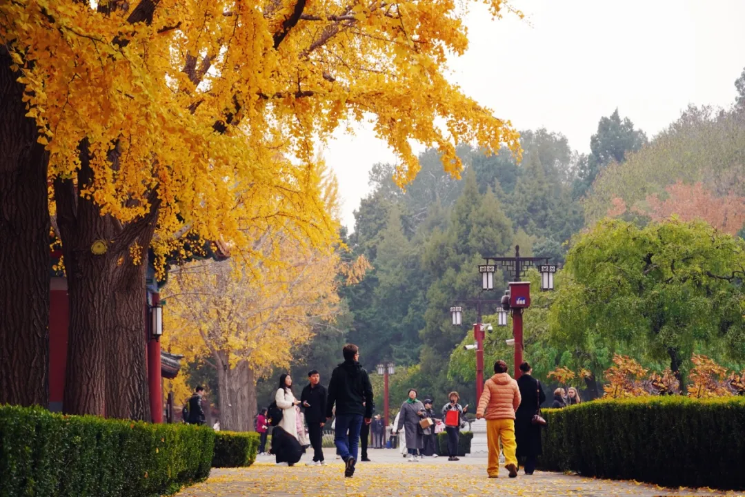走进北天门下的百米长径上,银杏叶像是被镀了层蜜蜡,铺在地上便连成一片流动的金毯。与皇乾殿北面相衬,更显古代建筑和天坛生态之美。