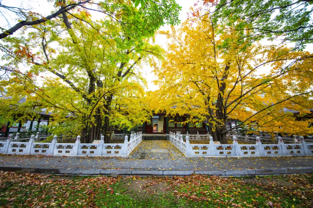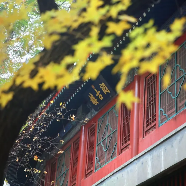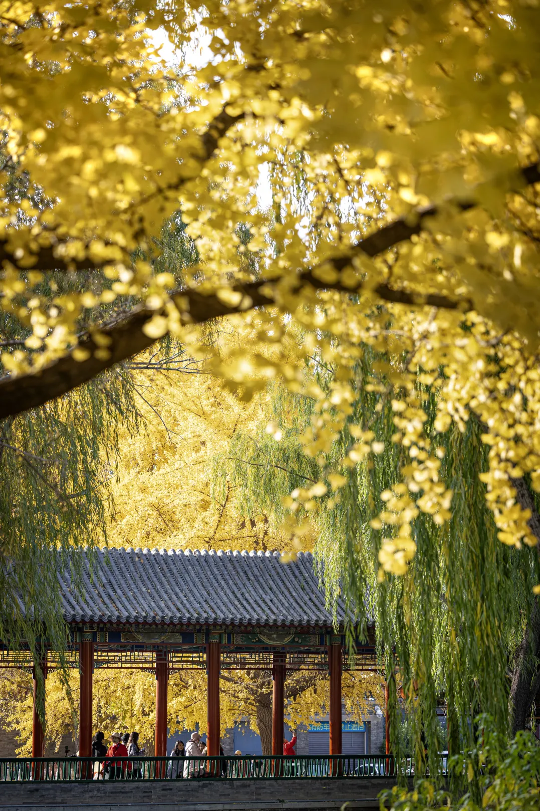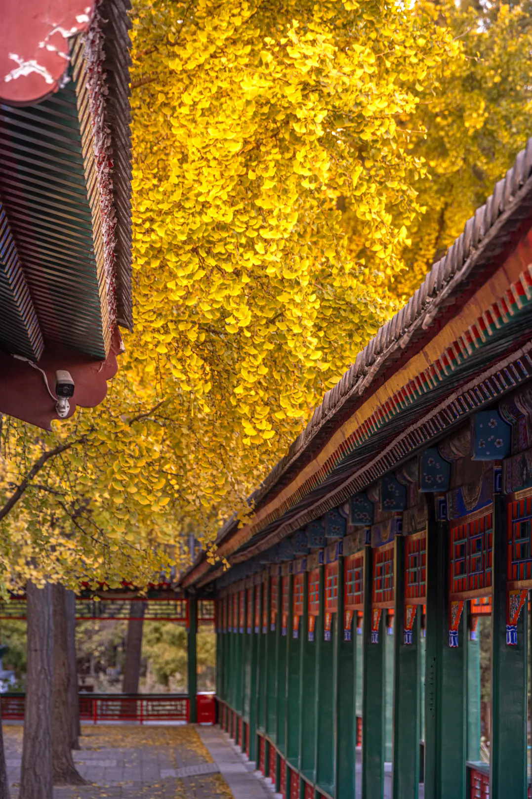 银杏树形高大,挺拔壮观,叶片形状如折扇,入秋叶子逐渐由绿色变为黄色,目前正呈现出漂亮的渐变颜色。金色的银杏叶与红墙古建相得益彰,颇有古韵秋色。