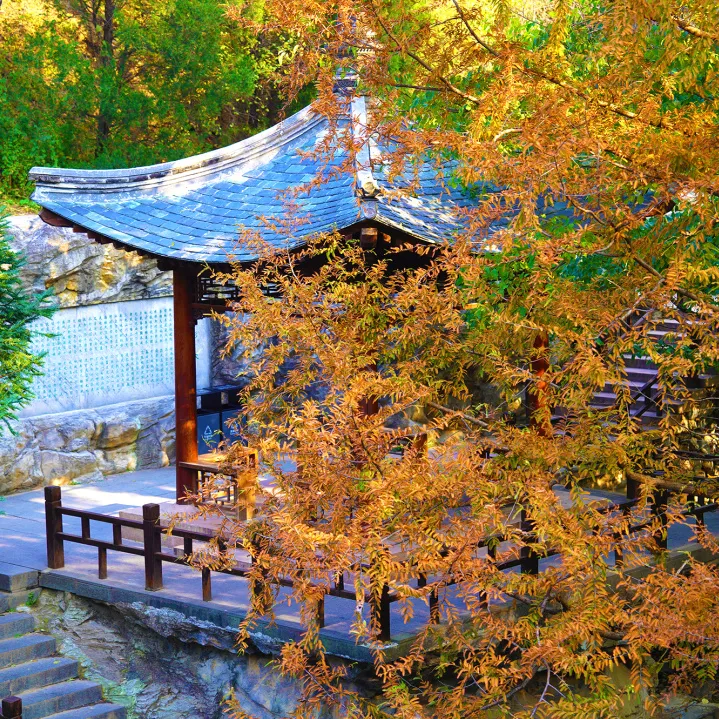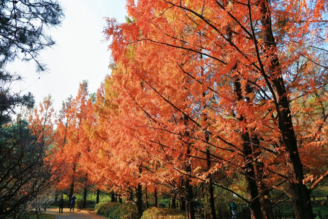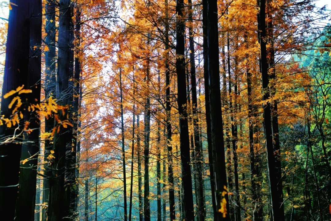 深秋之际,植物界的色彩渐渐淡去,此时位于樱桃沟内的水杉林将转为深褐色,尽显古朴肃穆。漫步于木质栈道之上,高大秀丽的树体蔽日遮天,繁茂的枝叶相互交织,置身其中,能深切感受到大自然的宁静与神秘。