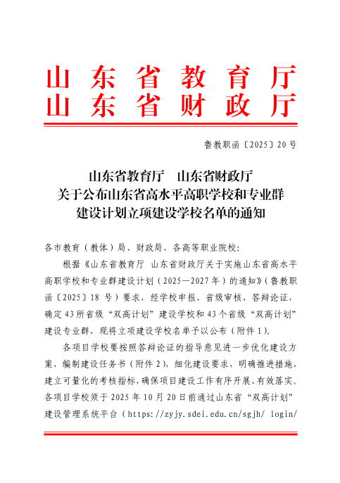 近日,山东省教育厅、财政厅联合发布《关于公布山东省高水平高职学校和专业群建设计划立项建设学校名单的通知》(鲁教职函〔2025〕20号),山东外事职业大学成功入选山东省“双高计划”建设学校,标志着学校发展迈入高水平职业大学建设新阶段,开启高质量发展新征程。