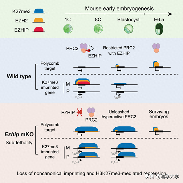 有趣的是,野生型胚胎中亲本来源的H3K27me3不对称性能维持到囊胚阶段,并介导非经典基因印记记忆;而EZHIP缺失后,H3K27me3不对称性在二细胞阶段已经完全丧失,导致非经典基因印记随之丢失。进一步的机制研究表明,着床前胚胎中EZHIP与PRC2能够共同结合在非经典H3K27me3结构域,在染色质上形成H3K27me3-PRC2-EZHIP复合体,以此限制PRC2的酶活和扩散。EZHIP缺失后,PRC2不再被限制,继而在全基因组大部分区域催化了H3K27me3修饰,掩盖了几乎所有亲本来源的H3K27me3记忆。与常规认知相悖的是,这种广泛分布的H3K27me3修饰并未引起全局性基因沉默,反而让H3K27me3丧失了原本的抑制功能,导致非经典印记基因的异常激活和印记X染色体失活的失调。这可能是因为H3K27me3的效应因子(例如PRC1和PRC2)被大量出现的H3K27me3稀释,无法有效富集在正确的靶基因区域,从而导致基因抑制功能失效。另外,EZHIP缺失所造成的H3K27me3在全基因组范围内的过度积累还阻碍了后续多梳靶基因区域H3K27me3的重建,并伴随着胚胎植入后部分致死现象。
