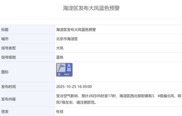 北京多区大风蓝色预警中