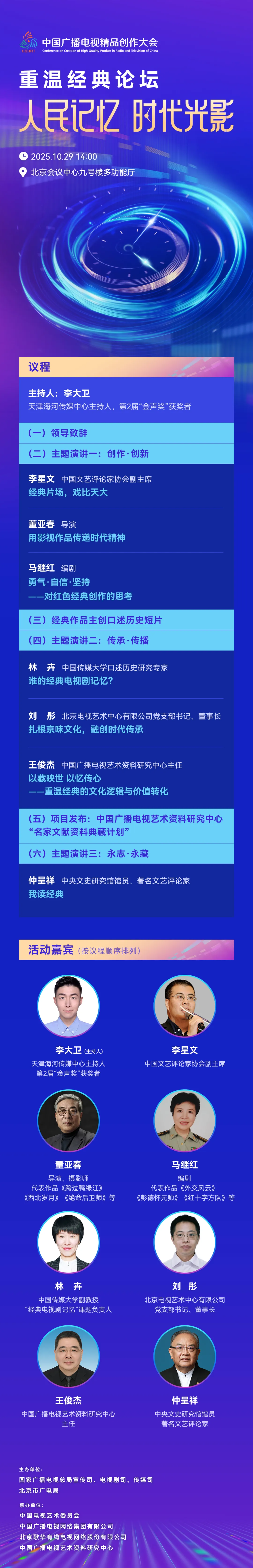 本场论坛围绕“人民记忆,时代光影”的主题设置议程,聚焦经典作品创作、传承、传播,分享经典背后的故事,展示广大电视文艺工作者激扬时代精神、勇攀艺术高峰取得的成就。同时,进一步总结开办“重温经典”频道,丰富电视大屏方面的好经验、好做法,助推“重温经典”频道实现更广传播,更好满足广大观众的精神文化需求。