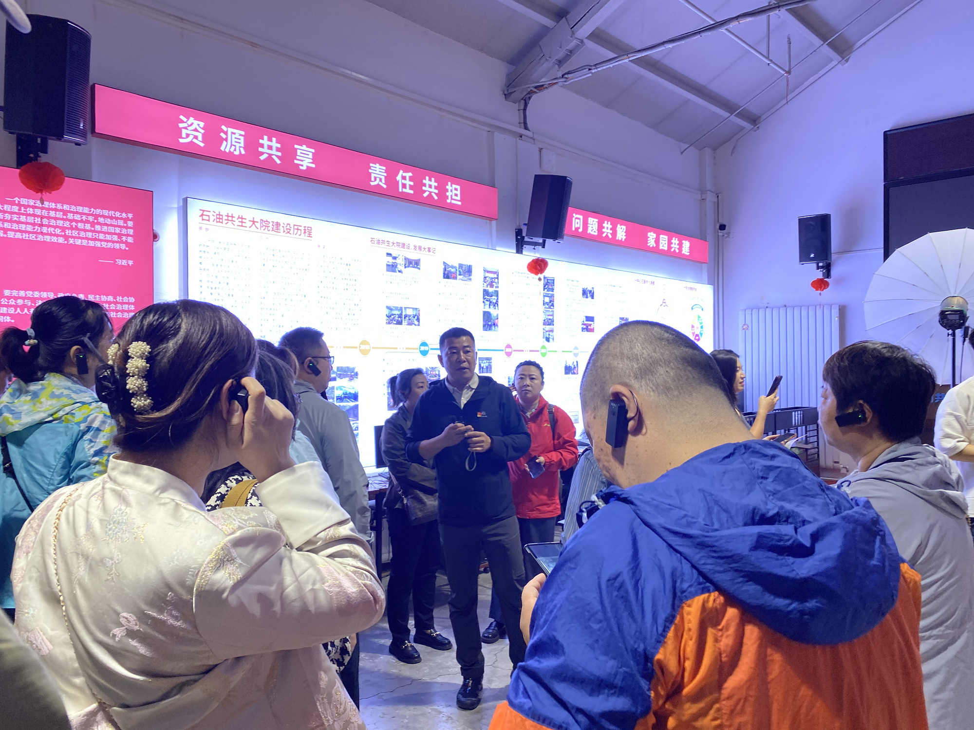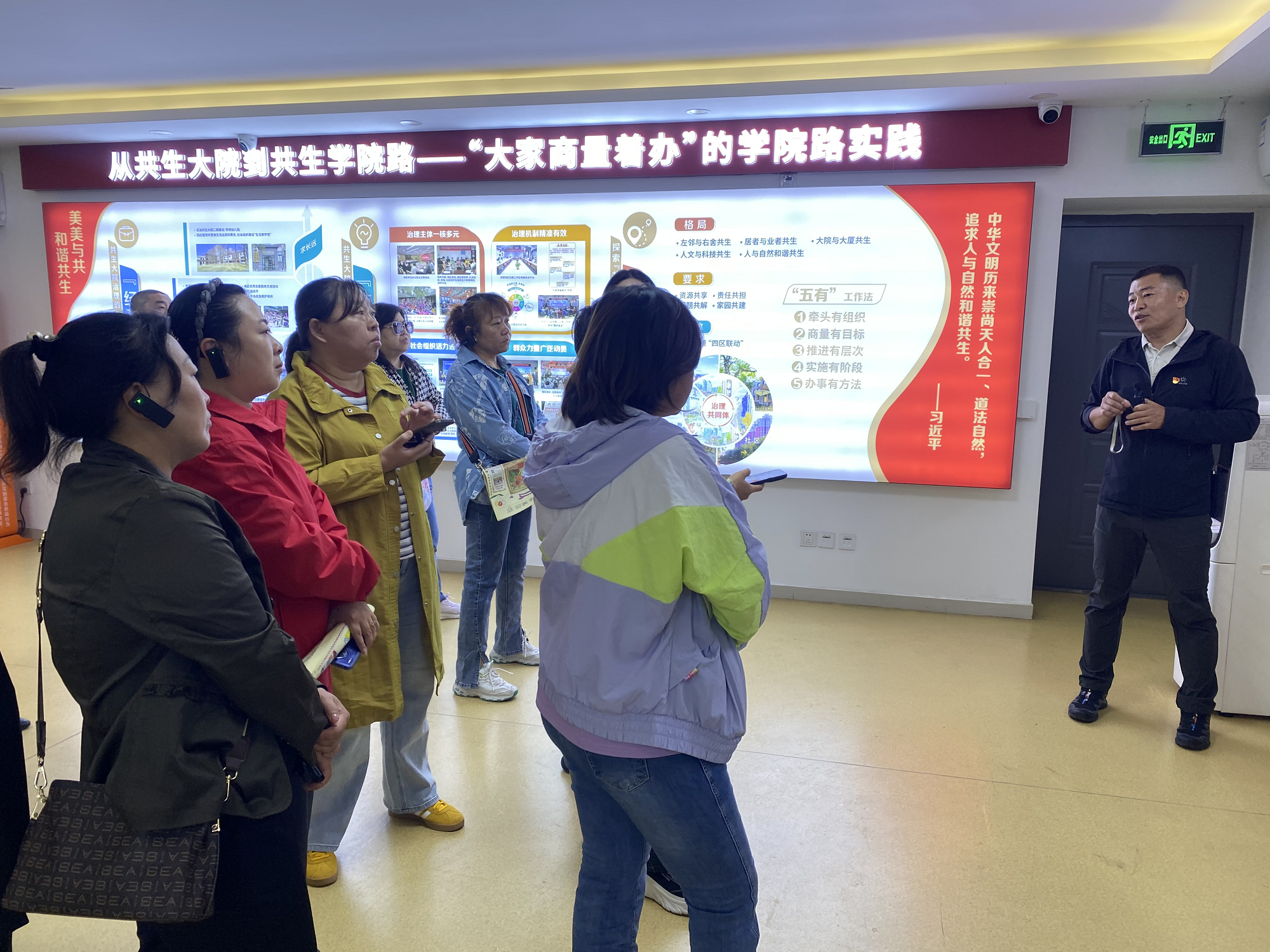 随后,石油共生大院社区书记张腾宇围绕 “党建引领、多方联动、资源共享、共建共治”这一核心内容,系统介绍了大院治理创新路径。通过建立“党建朋友圈”,联合辖区企业、高校、社会组织、志愿者团队等多方力量,形成治理主体一核多元、治理机制精准有效、群众力量广泛动员。同时,通过 “党建共建座谈会”、打造 “社区治理合伙人” 品牌等举措,推动各方从 “被动参与” 转向 “主动共建”。参观过程中,针对大家提出的“如何有效动员多元主体参与”“如何解决资源整合过程中的难点问题”张腾宇结合具体案例逐一进行了解答。