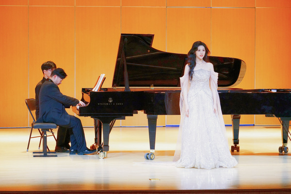 音乐会上,特邀嘉宾北京大学教师、青年花腔女高音梁裕献上了两首经典歌曲《圣洁的女神》《我爱这土地》,将音乐会推向了另一个高潮。