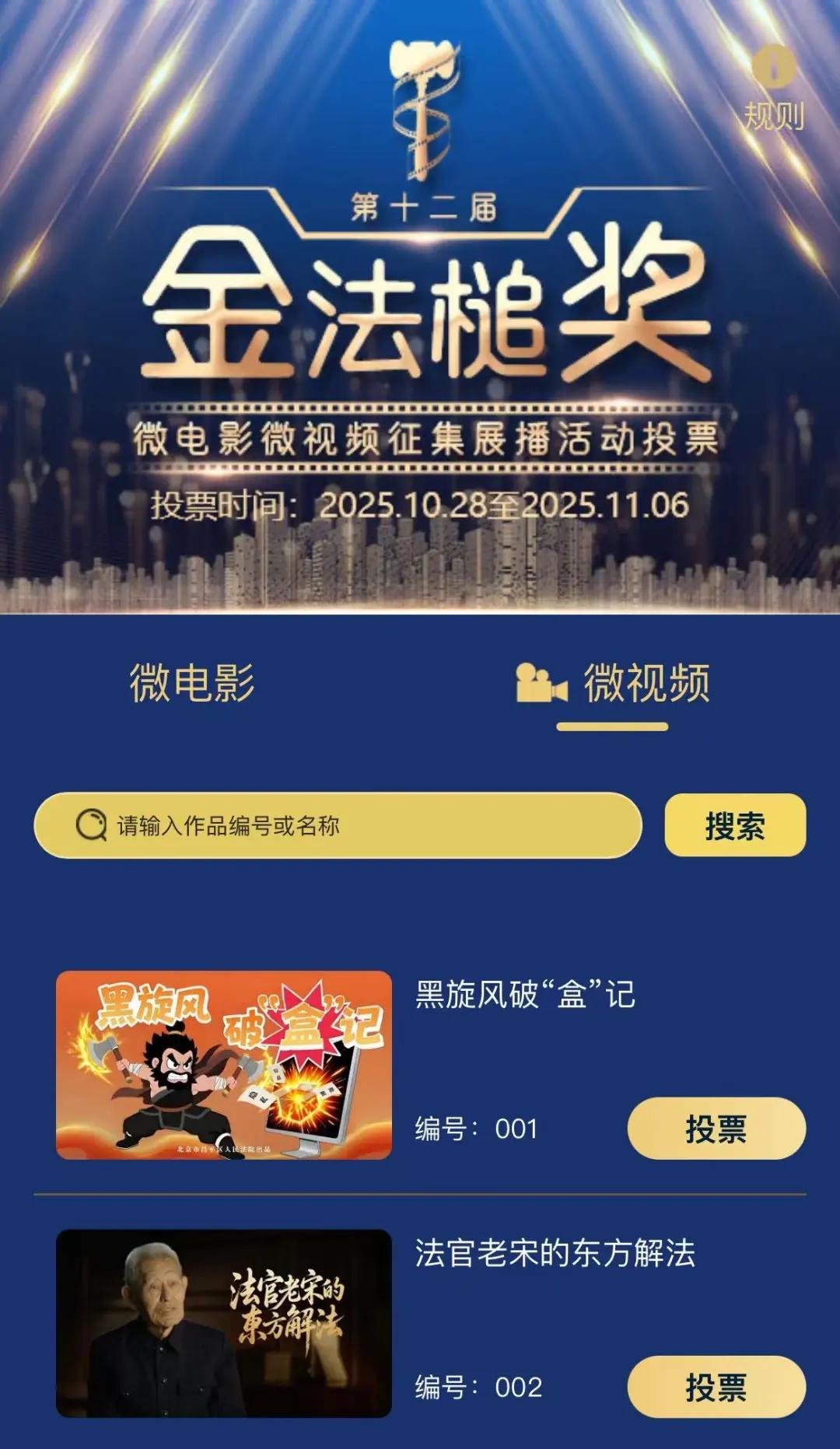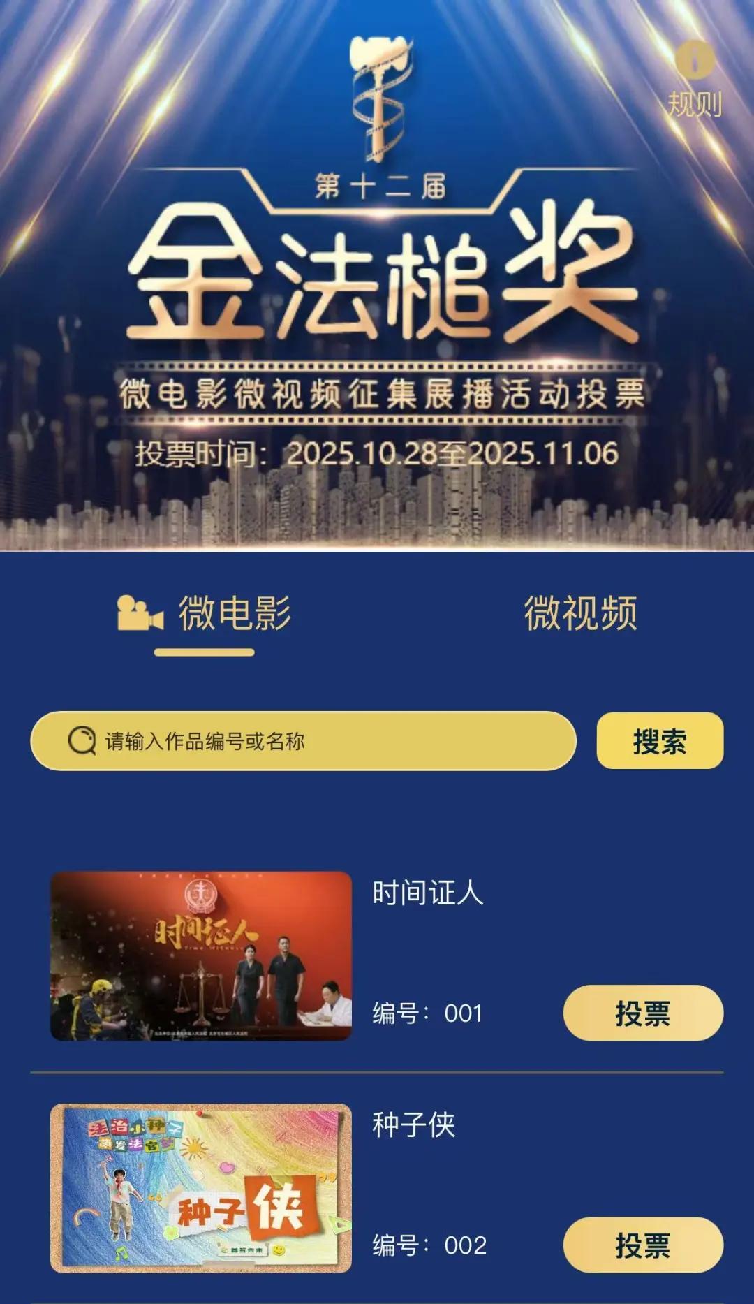 2.进入第十二届“金法槌奖”投票页面后,选择“微电影”“微视频”搜索作品名或编号即可投票。