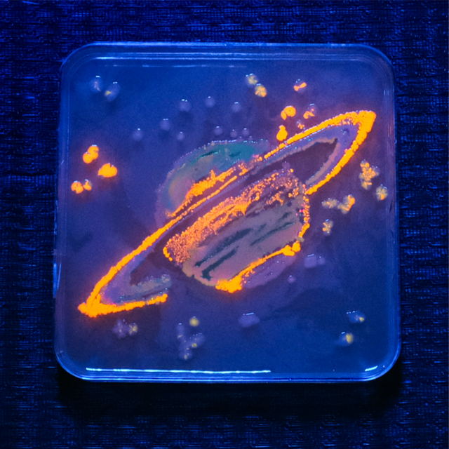 作品创意:作品以荧光菌落模拟出星球,将10⁻⁹米的生命结构与10⁹米的天体尺度融为一体。试图诠释“一花一世界”的哲思:多么渺小的局部,都可以全息的方式,映现整个宇宙的全部信息与壮丽图景。