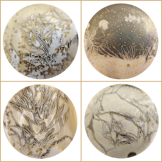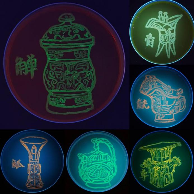 作品创意:传统酒器曾见证宴饮雅集、礼仪传承,承载千年酒文化记忆。作品将古老酒器以荧光图案呈现,让四羊方尊、青釉提梁倒灌壶、父乙觥、饕餮纹觯等古老酒器在菌皿上重生。旨在用新奇视觉语言,唤醒对传统酒器文化的关注,为非遗文化传承与科学艺术融合提供全新视觉表达,使千年酒器文化借微生物荧光 “重生”,展现独特跨学科艺术魅力。