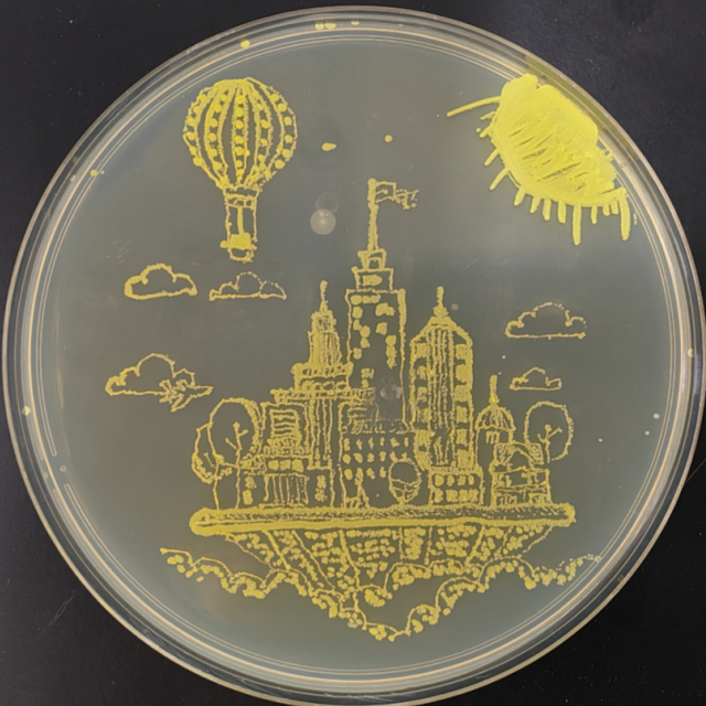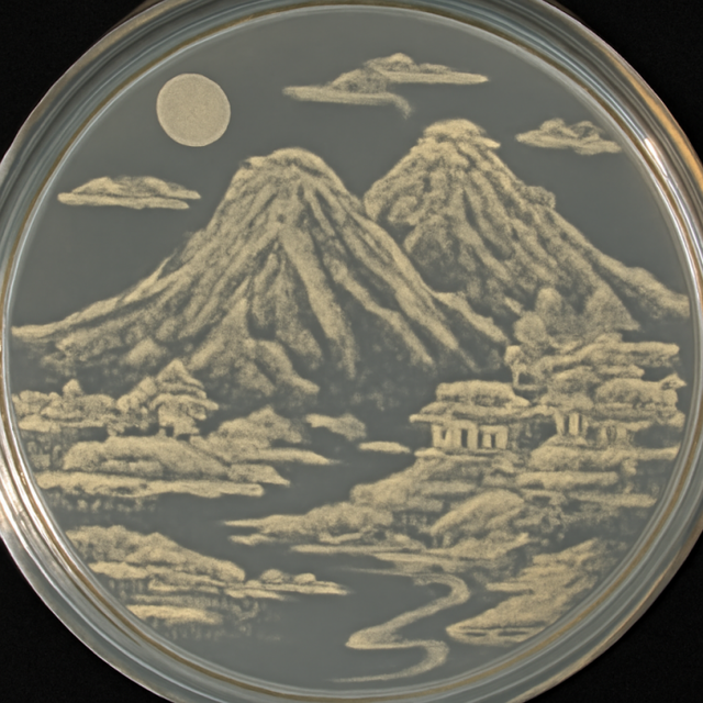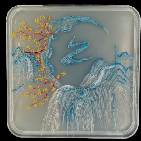 作品创意:这幅微生物山水画在琼脂平板上以简洁粗犷的方式呈现了传统的中国山水景象,通过微生物的生长展现了自然的和谐与宁静。画面中的山脉、河流与房屋,象征着人类与自然的共生与平衡,而粗糙的线条和模糊的轮廓则让作品带有一种朴素与原始的质感,传递出一种回归自然、寻求内心平静的情感。