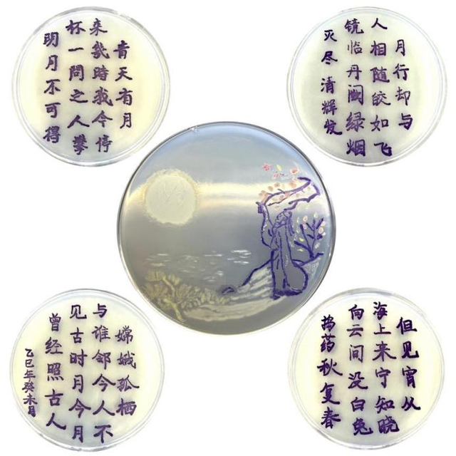 作品创意:作品以微生物生长轨迹勾勒《把酒问月》诗句,让肉眼难见的生命与千年诗魂对话。恰似时光酝酿诗篇的沉淀,菌落晕染的朦胧质感呼应月色清辉,既映现“今月照古人”的时空对话,又以菌落的聚散暗合“月行与人相随”的羁绊。