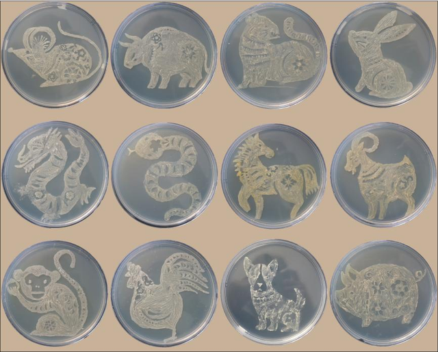 作品创意:以酵母菌绘十二生肖,融微观生命与传统文化。酵母发酵喻转化新生,聚个体成整体显合力。生肖寄吉祥,“运锦程” 寓前程,显自然与艺术共生之妙。
