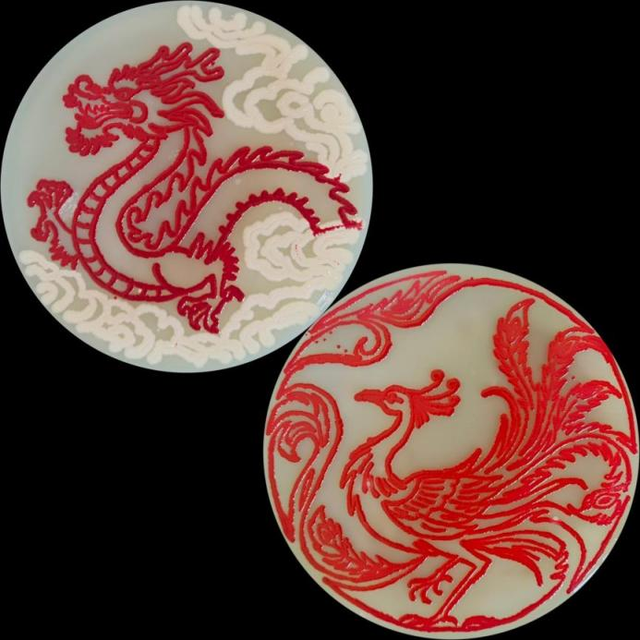 作品创意:作品选择链接微生物与传统文化的符号,创造跨时空对话,微生物的繁衍如同文化传承,我们将菌火红的颜色的特征与中国传统文化的龙与凤相融合,体现龙凤呈祥的美好主旨。