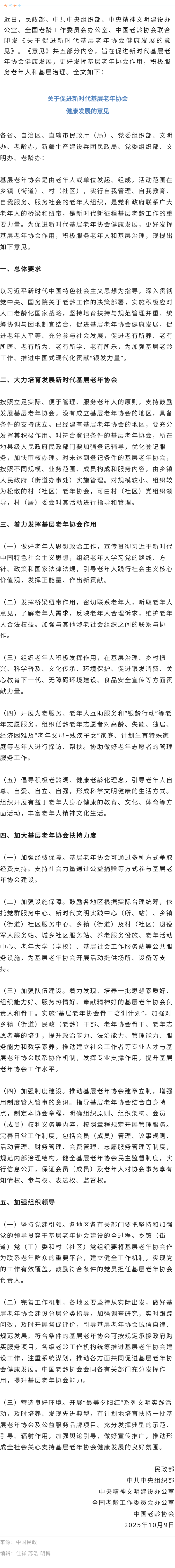 民政部等五部门联合印发《关于促进新时代基层老年协会健康发展的意见》