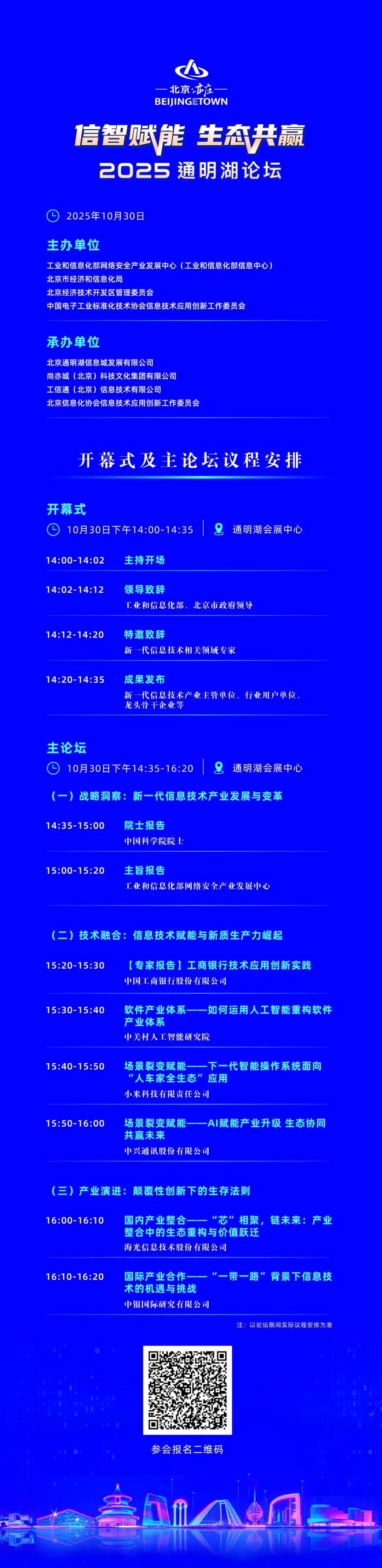 10月30日,2025通明湖论坛开幕式主论坛将在北京经济技术开发区(北京亦庄)通明湖会展中心举办。本届论坛以“信智赋能 生态共赢”为主题,设置“开幕式+主论坛+平行分论坛”等活动单元,聚焦信息技术创新、前沿技术融合应用、行业数字化转型、信息网络安全,搭建各方交流合作的高效平台,打造信息技术应用创新产业高地。