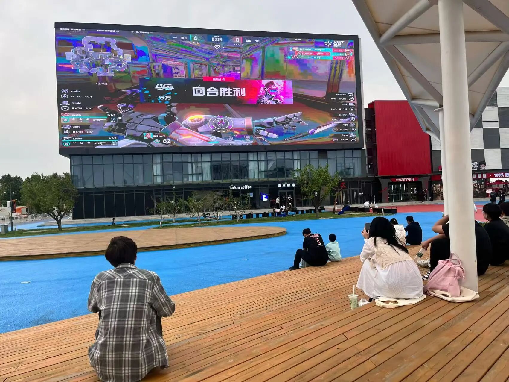 △电竞爱好者围坐在户外超高清LED折角大屏前观看比赛。资料图