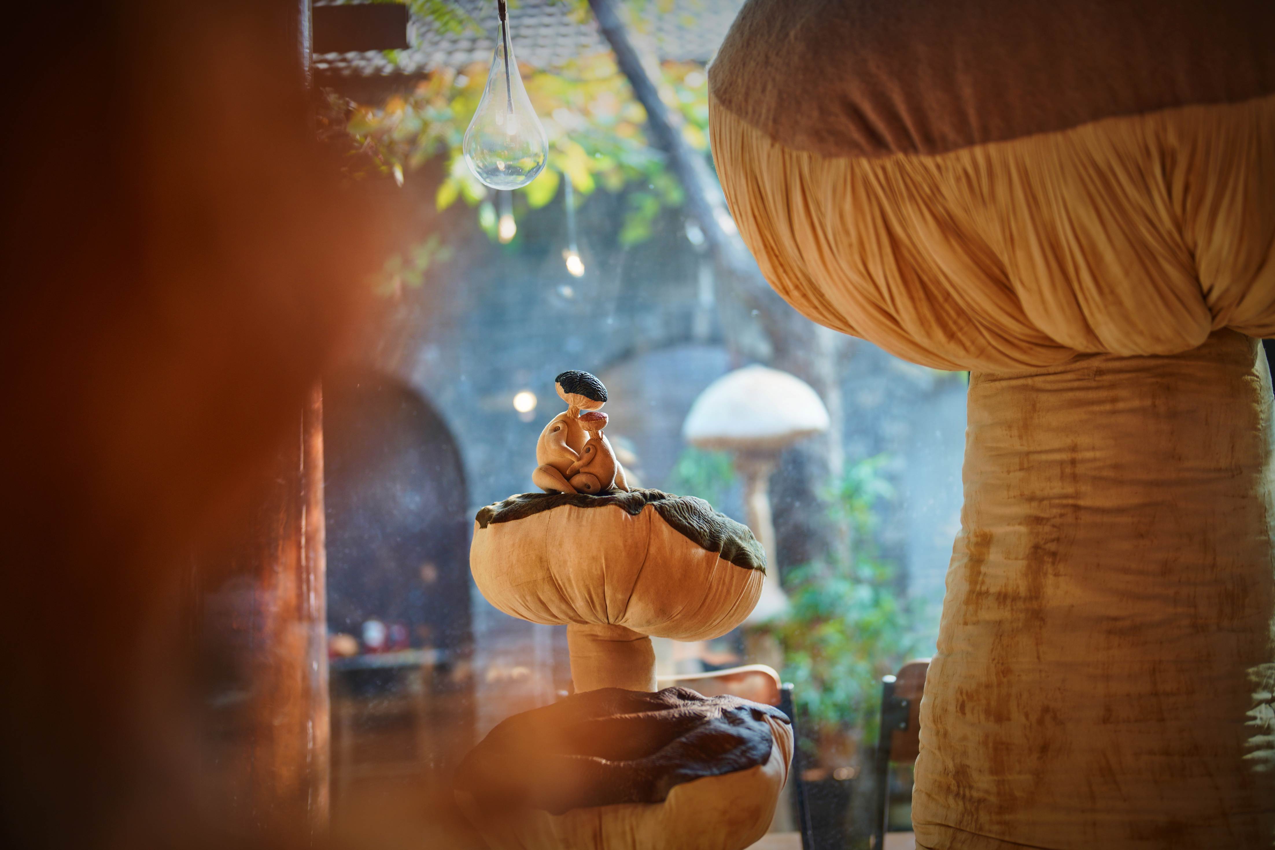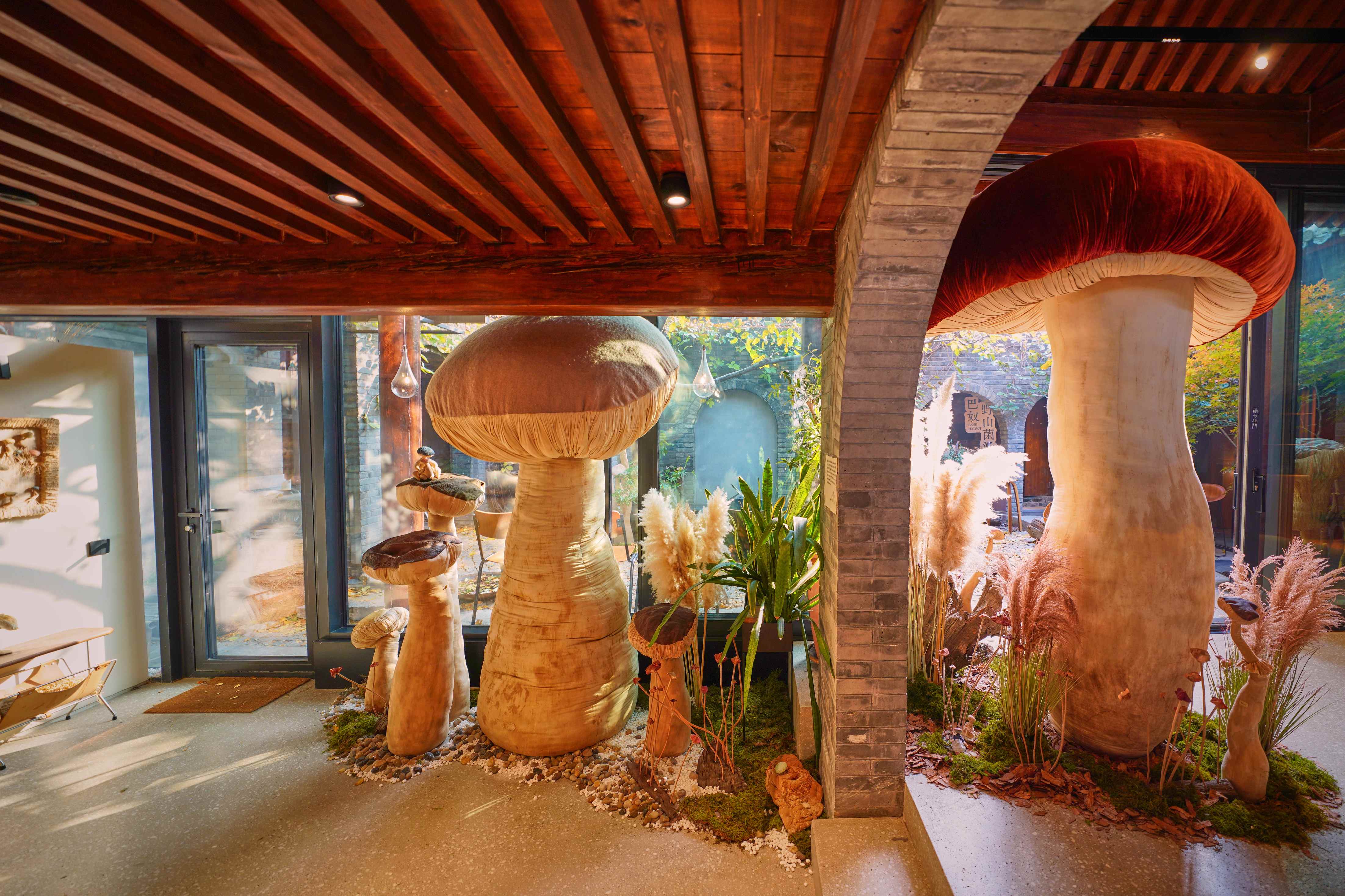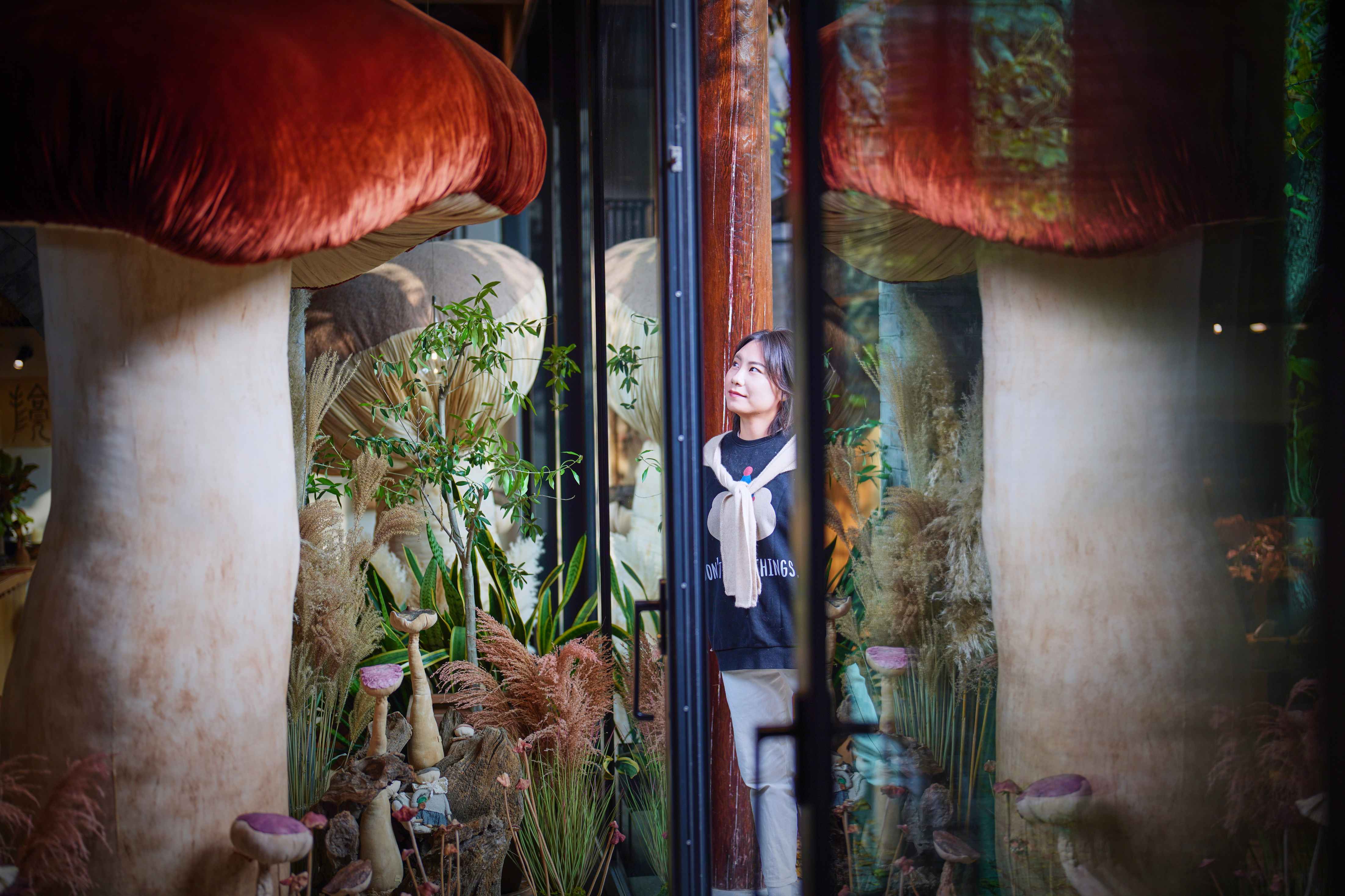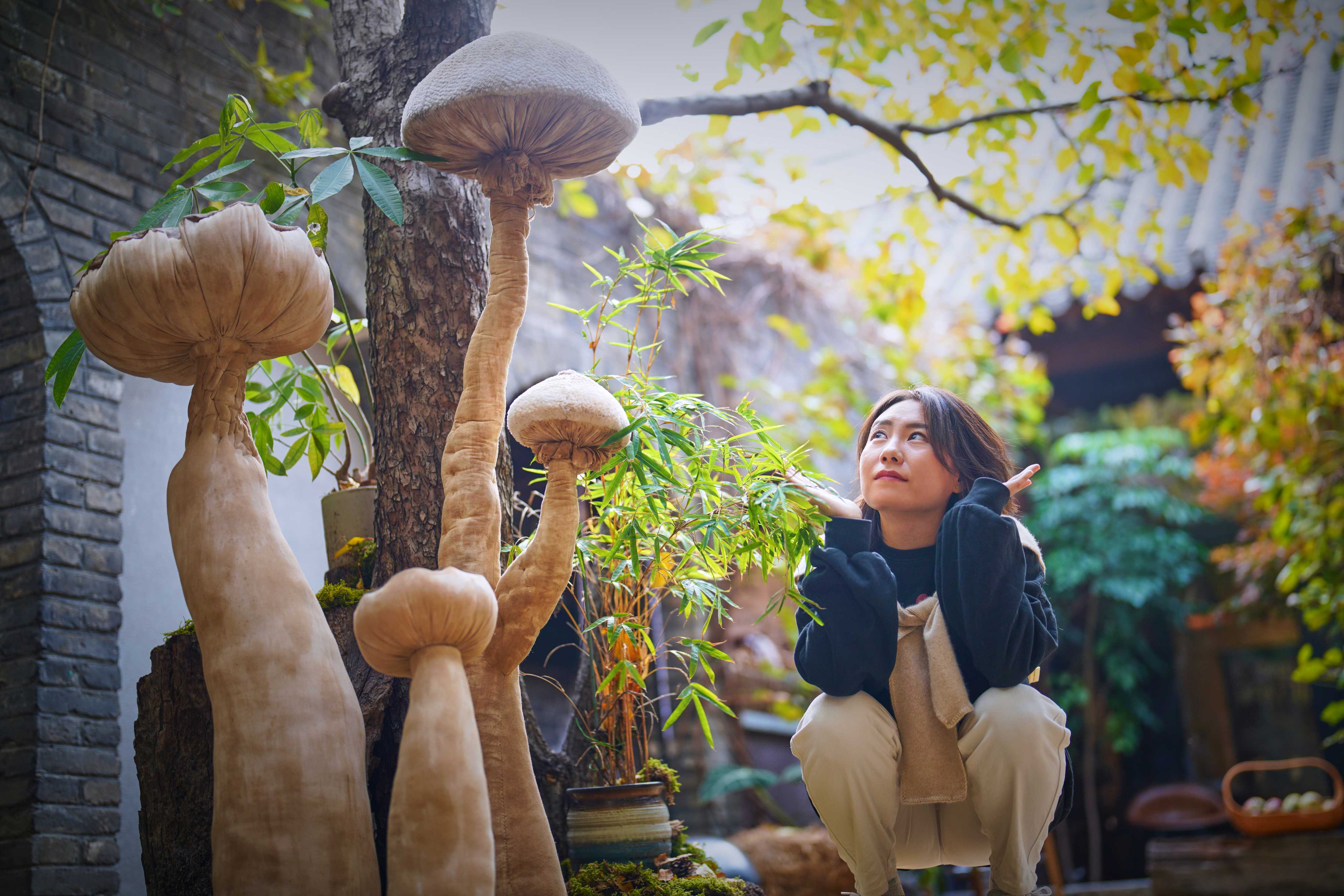 大大小小的蘑菇丛丛簇簇,依偎在海棠树下、停驻在房梁木上、静立在落地窗边……构筑出一个童话般的“共生”世界。